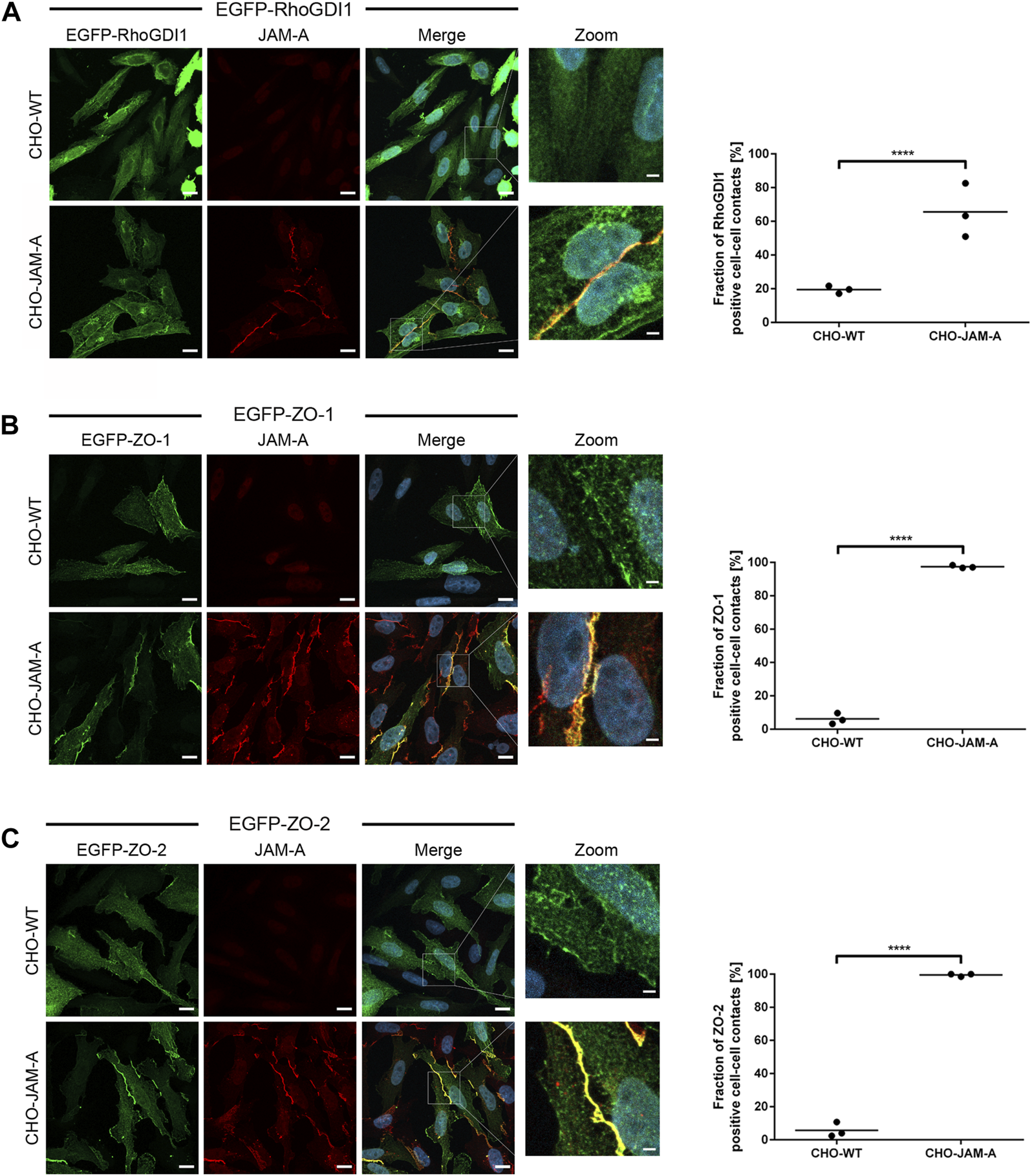Quantification of RhoGDI1 recruitment by JAM-A. CHO WT cells (CHO-WT) or CHO cells stably expressing mJAM-A (CHO-JAM-A) were transiently transfected with either EGFP-RhoGDI1 (A), EGFP-ZO-1 (B) or EGFP-ZO-2 (C). Cells were stained with antibodies against JAM-A and with DAPI. Zoom pictures show high magnifications of the areas depicted by white squares in the merged images. Scale bars: 10 µm (regular images), 2 µm (insets). Plots show quantifications of cell-cell contact localization of EGFP-RhoGDI1, EGFP-ZO-1 and EGFP-ZO-2. In control cells (CHO-WT), cell-cell contact sites were identified on the basis of the cytoplasmic EGFP signal. Only cell-cell contact sites which showed no intercellular gaps on the basis of the EGFP fluorescence signals were included (examples are shown in the high magnification (Zoom) images. In JAM-A-transfected cells (CHO-JAM-A), cell-cell contact sites were identified on the basis of the junctional JAM-A fluorescence signals. Graphs show the fraction of EGFP-positive cell-cell contacts. Statistical analysis was performed with Fisher’s test. Data is derived from N = three independent experiments, each data point represents the mean value of one experiment. Number of analyzed cell-cell contacts: (A) EGFP-RhoGDI1: n (CHO-WT) = 131, n (CHO-JAM-A) = 155; (B) EGFP-ZO-1: n (CHO-WT) = 115, n (CHO-JAM-A) = 192; (C) EGFP-ZO-2: n (CHO-WT) = 128, n (CHO-JAM-A) = 162. ****p < 0.0001.