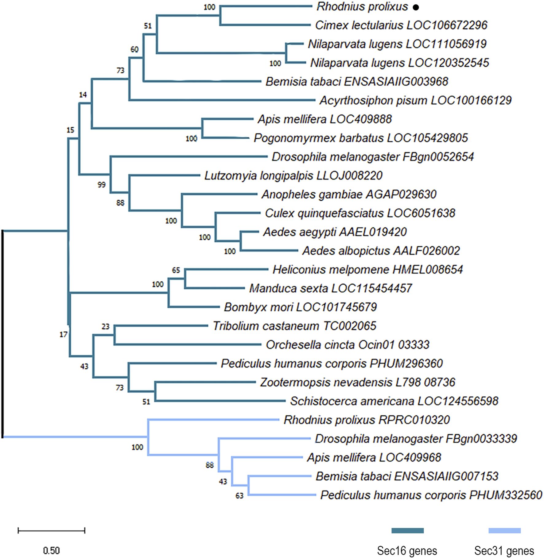 Maximum likelihood phylogenetic analysis of proteins with PF12931 domain across species. Sequences were aligned using the MUSCLE tool and the phylogenetic tree reconstruction was made using the maximum likelihood method. The tree was designed with 1000 replicates of rapid bootstrap statistics. Dark blue represents Sec16 proteins from different species. Light blue represents Sec31 proteins from different species. R. prolixus Sec16 is dot-marked.