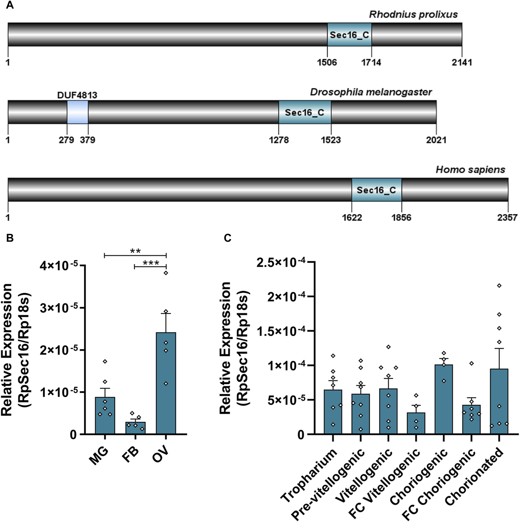 Sec16 is highly expressed in the ovary and is present in all stages of oogenesis in vitellogenic females. (A) Representative scheme of the Sec16 protein from R. prolixus, D. melanogaster, and H. sapiens and their conserved domains Sec16_C (pfam12931), the binding domain of the Sec23 protein. (B) RT-qPCR showing the relative expression levels of Sec16 in different organs of the adult female. MG: Midgut; FB: Fat body; OV: Ovary. (n = 5–6). One-way ANOVA. (C) RT-qPCR showing the relative expression levels of Sec16 throughout all stages of oogenesis. (n = 4–8). One-way ANOVA. Graphs show mean ± SEM. **p < 0.01, ***p < 0.001.