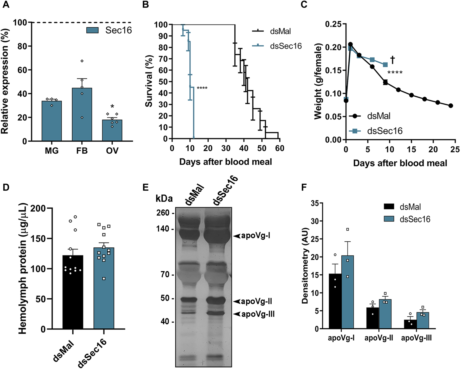 Silencing of Sec16 results in reduced lifespan, impaired weight loss and higher levels of Vg in the hemolymph. (A) RT-qPCR shows the Sec16 knockdown efficiencies in the different organs 7 days after the blood meal. MG: Midgut; FB: Fat body; OV: Ovary. (n = 4–6). t-test. (B) Survival rates of control and dsSec16-injected females (n = 20). Log-rank (Mantel-COX) test. (C) Effects of Sec16 silencing on female digestion, showing their weight during the digestion cycle (n = 20). Two-Way ANOVA. (D) Control and silenced hemolymph protein quantifications 7 days after the blood meal. (n = 12). t-test. (E) 10% SDS-PAGE of the hemolymphs. Arrowheads point to the vitellogenin apoproteins. (n = 3). (F) Densitometry of the Vg apoproteins apoVg-I, apoVg-II and apoVg-III shown in (E) (n = 3). t-test. †: Indicates the death of all individuals. AU: Arbitrary units. Graphs show mean ± SEM. *p < 0.05, ****p < 0.0001.