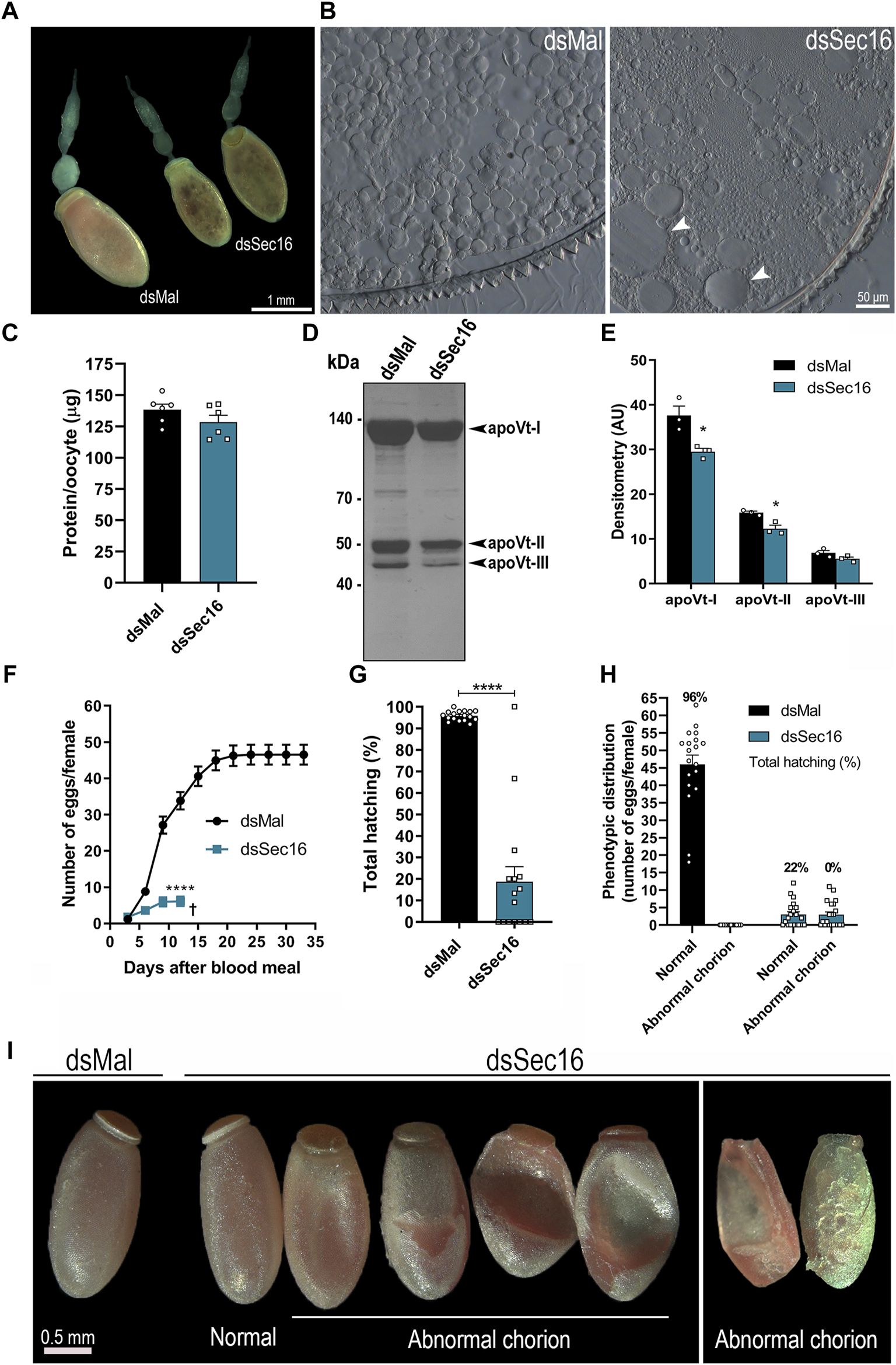 Silencing of Sec16 results in abnormal oogenesis. (A) Representative images of ovarioles. Scale bar: 1 mm. (B) Representative images of cross-sections from silenced and control choriogenic oocytes under the light microscope. Scale bar: 50 μm. (C) Choriogenic oocytes protein quantifications, dissected 7 days after the blood meal. (n = 6). t-test. (D) 10% SDS-PAGE of choriogenic oocytes. Arrowheads point to the vitellin apoproteins. (n = 3). (E) Densitometry of the Vt apoproteins apoVt-I, apoVt-II and apoVt-III shown in (D) (n = 3). t-test. (F) Oviposition of control and silenced females during the gonotrophic cycle. (n = 20). Two-Way ANOVA. (G) F1 total hatching rates after Sec16 silencing. (n = 20, with 884 eggs dsMal and 122 eggs dsSec16). t-test. (H) Phenotypic distribution of control and silenced eggs and their respective viabilities. (n = 20). (I) Representative images of eggs laid 24–96 h after oviposition. Scale bar: 0.5 mm. AU: Arbitrary units. Graphs show mean ± SEM. *p < 0.05, ****p < 0.0001.