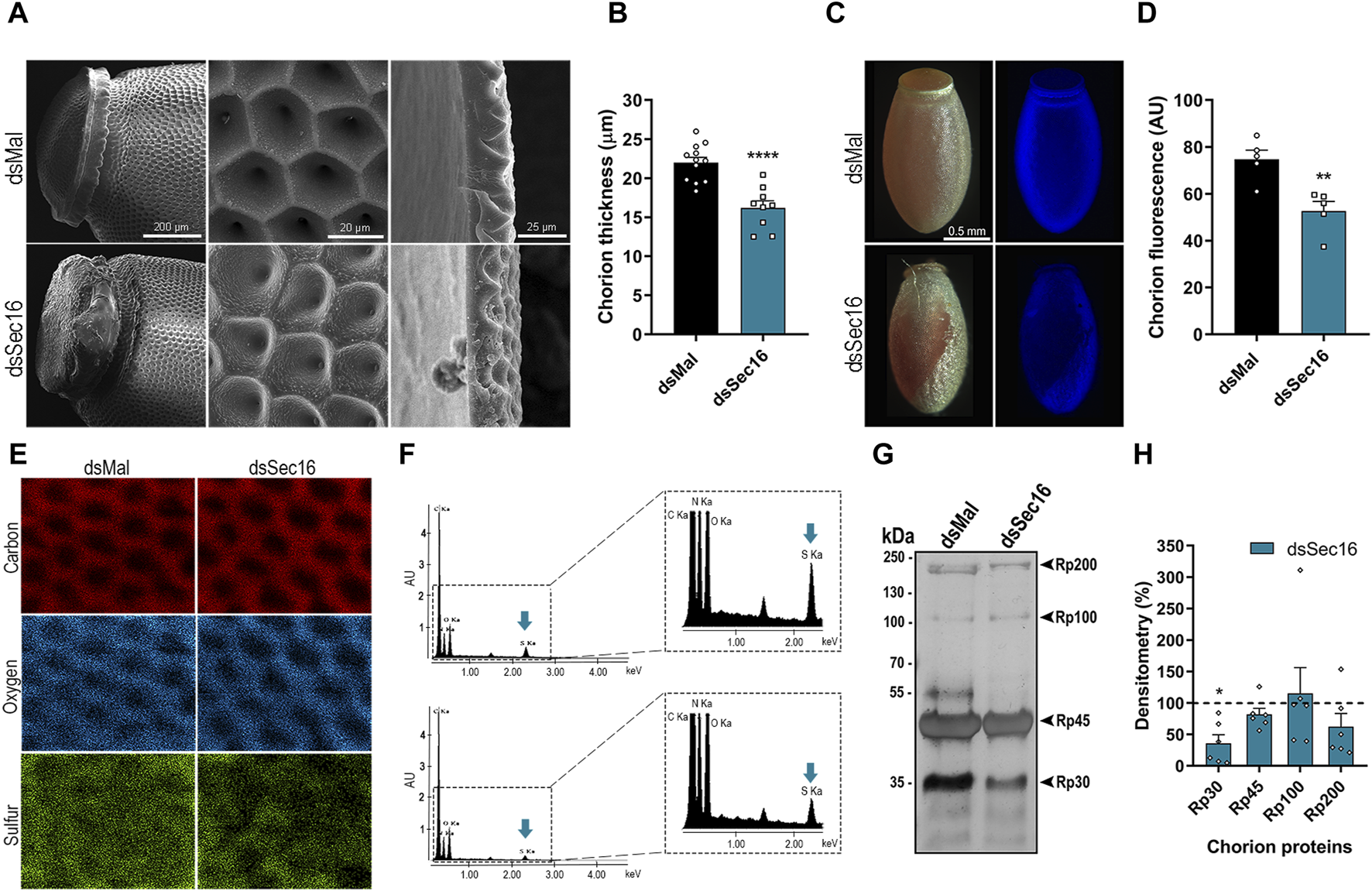 Sec16 deficiency results in abnormal chorion biogenesis. (A) SEM images evidencing the abnormal ultrastructure of the operculum and the exochorion surface and the reduced chorion thickness in Sec16 eggs up to 72 h after oviposition. Representative images of 4 different images. Scale bar: 200, 20, and 25 μm, respectively. (B) Mean thickness of the chorion of control and silenced eggs. (n = 12, with 3 measurements of different regions of each image). t-test. (C,D) Silencing of Sec16 decreased the tyrosine crosslinking rates in the eggs. (C) Representative images of the dityrosine fluorescence in eggs chorion under UV light. Representative images of 5 different control and silenced images. Scale bar: 0.5 mm. (D) Mean of dityrosine fluorescence quantification using ImageJ software. (n = 5). t-test. (E,F) Sec16 deficiency results in chorion defective elemental composition. (E) Effect of silencing on the distribution of elements on the exochorion surface. (F) Signals obtained from the spectra of the different elements. The right figure shows the spectra in an expanded form. Representative images of 5-6 different control and silenced images. Blue arrows indicate the element sulfur. (G,H) Sec16 silencing reduces the level of Rp30, 1 of the main chorion proteins. (G) 10% SDS-PAGE of chorion proteins from 0 to 72 h eggs, extracted in urea. Representative image of 3 different gels. Arrowheads indicate Rp30, Rp45, Rp100, and Rp200. (H) Densitometry of the protein bands indicated in G performed using ImageJ software. (n = 6). t-test. AU: Arbitrary units. Graphs show mean ± SEM. *p < 0.05, **p < 0.01, ****p < 0.0001.