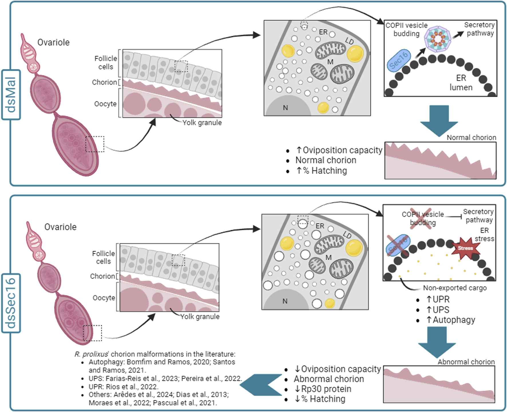Schematic diagram summarizing the effects of silencing Sec16 in the chorion formation in R. prolixus. In the control condition (dsMal), during the choriogenesis process, the FCs act in the synthesis and secretion of the chorion components. Within the FCs, chorion proteins are directed from the ER to the Golgi apparatus via COPII vesicles, proceeding through the entire secretory pathway. This pathway allows the correct export of the chorion components to the extracellular space and their deposition over the oocyte cell membrane, enabling the production of eggs with a rigid eggshell capable of protecting the developing embryo. On the other hand, in the silenced condition (dsSec16), our data suggest that Sec16 silencing results disturbed proteostasis (ER stress) in the FCs under due to the hindered exportation of the cargo through COPII vesicles. This disruption is evidenced by the upregulation of genes involved in cellular proteostasis pathways (UPR, UPS and autophagy) and the expansion of ER lamellae compared to the control condition, consistent with previous findings by Bomfim and Ramos, 2020. As a result, the faulty functioning of the FCs leads to the production of malformed chorions, with reduced thickness and lower amounts of the Rp30 protein, culminating in reduced embryonic viability rates. In addition, the silencing of several other genes has been previously reported to culminate in chorion malformations, indicating that the coordination of choriogenesis by the FCs is a complex and sensitive process in R. prolixus. ER: Endoplasmic reticulum; LD: Lipid droplets; M: Mitochondria; N: Nucleus.