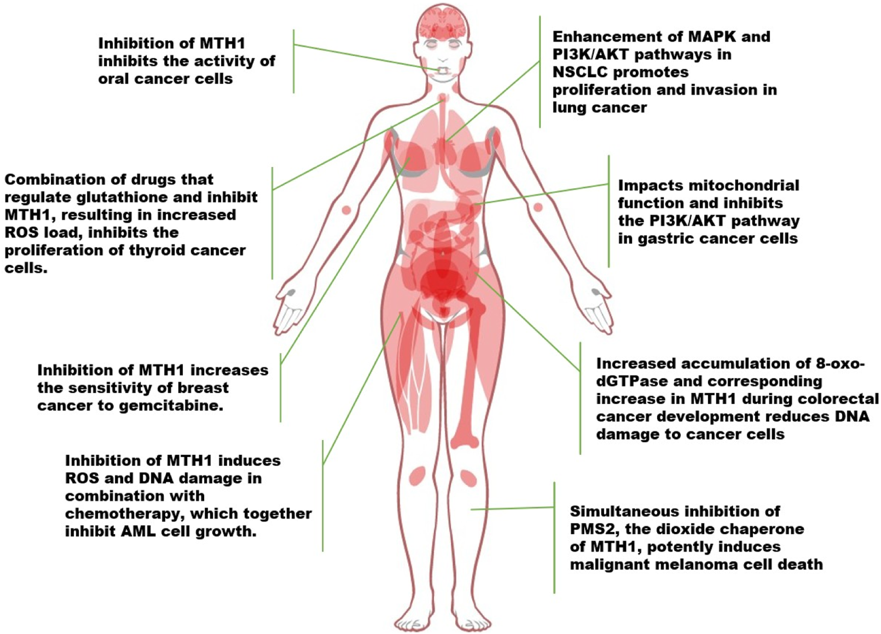 Other oncogenes, such as NF-κB, MYC, and PI3K, are known to produce ROS, leading to heightened levels of oxidative DNA damage in cells expressing these genes. In tumor cells, MTH1 acts as a protective factor against DNA damage, potentially to avert apoptosis induced by such damage, and may be upregulated in response. This active role of MTH1 has been observed in various cancer types. For instance, in oral cancer treatment research, Shi et al. discovered that counteracting MTH1 activity, in combination with MDR1 siRNA, synergistically inhibited oral cancer cells (Shi et al., 2019). The deletion of MTH1 results in the downregulation of glutathione-dependent oxidative stress (OS) defense system factors. Similarly, studies in thyroid cancer have shown that downregulating MTH1 expression, particularly when combined with drugs regulating the glutathione pool, increases ROS levels in cancer cells. This escalation in ROS impedes the proliferation of thyroid cancer cells and enhances the anticancer efficacy of MTH1 inhibitors (Arczewska et al., 2020; Liao et al., 2020).