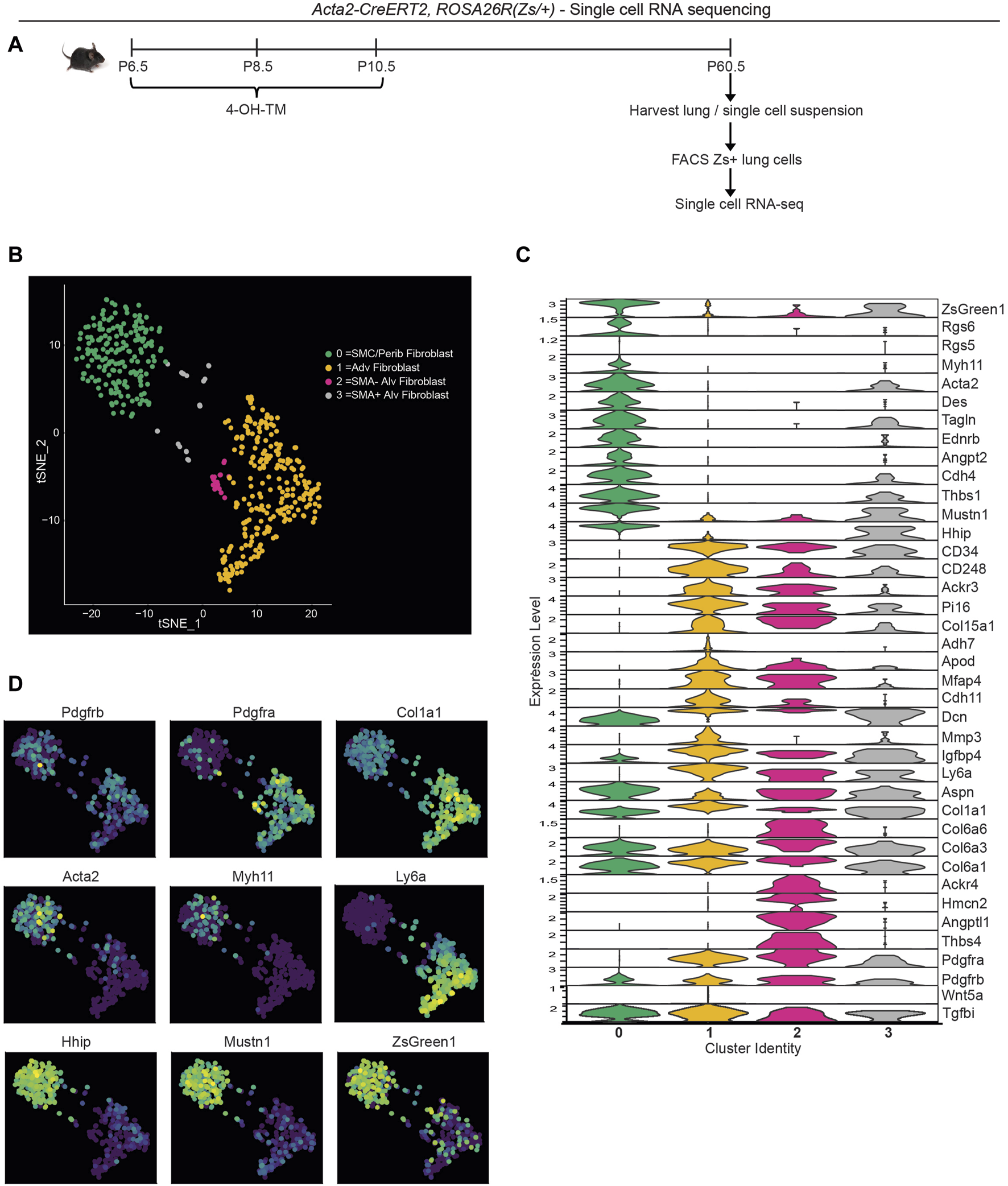 Single cell RNA sequencing of lineage-traced early postnatal SMA+ cells in adult lung. Acta2-CreERT2, ROSA26R(Zs/+) mice were induced with 4-OH TM at P6.5, P8.5 and P10.5. At P60.5, lungs were harvested. Zs+ cells of the lung were isolated by FACS and subjected to scRNA library construction (10X Genomics), sequencing, annotation and clustering. (A) Schematic of experiment. (B) tSNE plot with cells colored by their categorized cell-type identity. (C) Violin plot showing expression levels of representative marker genes in each cluster. (D) Same tSNE plot as in (B) colored based on normalized expression levels of indicated transcripts.
