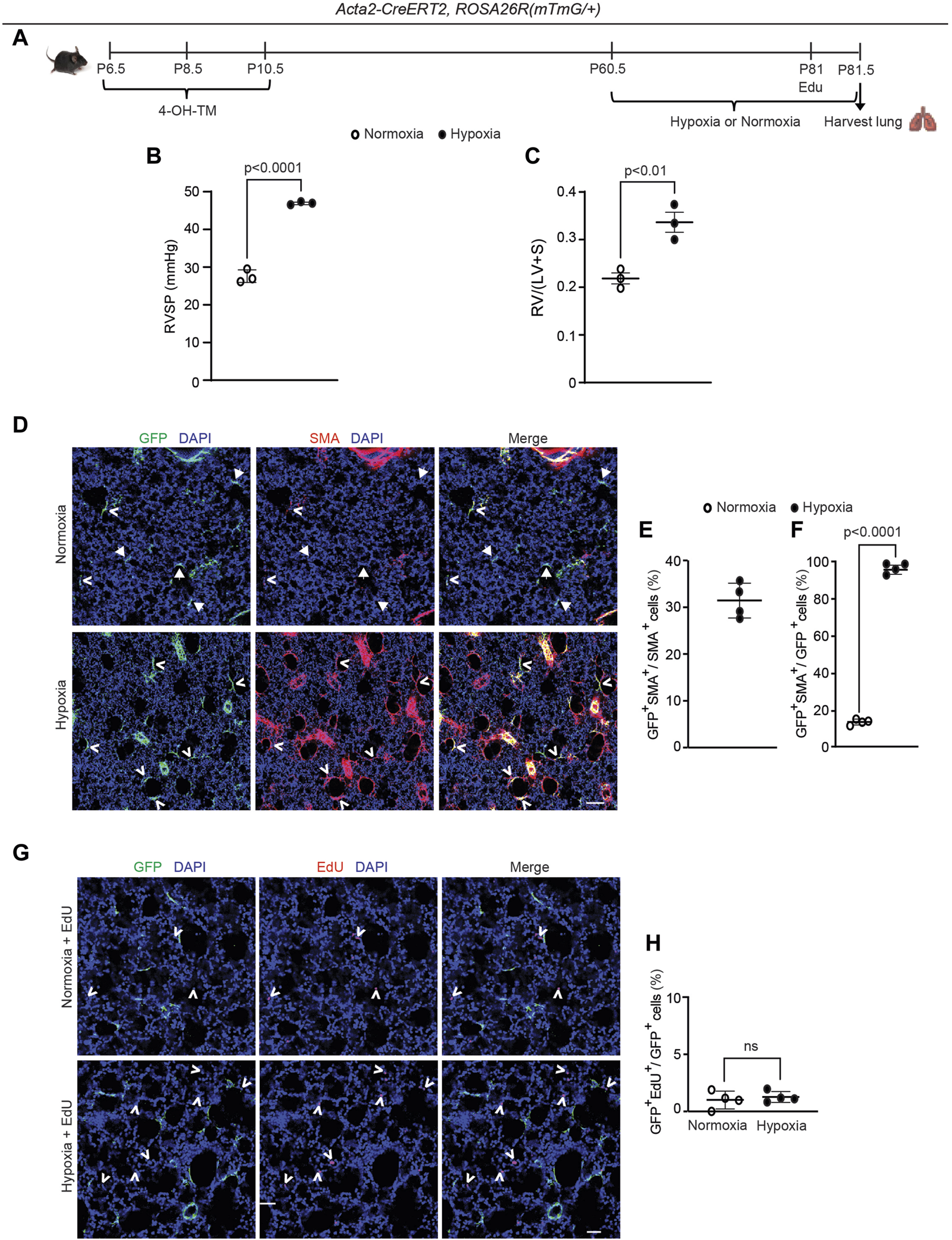 Acta2-CreER T2 , ROSA26R (mTmG/+) mice were injected with 4-OH-TM (65 µg/gm body weight per day) at P6.5, P8.5 and P10.5, and then starting at P60.5, mice were subjected to hypoxia for 21 days. Twelve hours prior to euthanasia, mice were injected intraperitoneally with 2.5 mg of 5-ethynyl-2′-deoxyuridine (EdU; Thermo Fisher Scientific). Lungs were harvested, fixed in 4% PFA overnight, permeabilized in 0.5% PBS-T for 30 min and stained with the Click-iT EdU Alexa Fluor Imaging Kit per instructions of the manufacturer (Thermo Fisher Scientific). Sections were co-stained for GFP and nuclei (DAPI). The percent of GFP+ cells that express EdU were quantified.