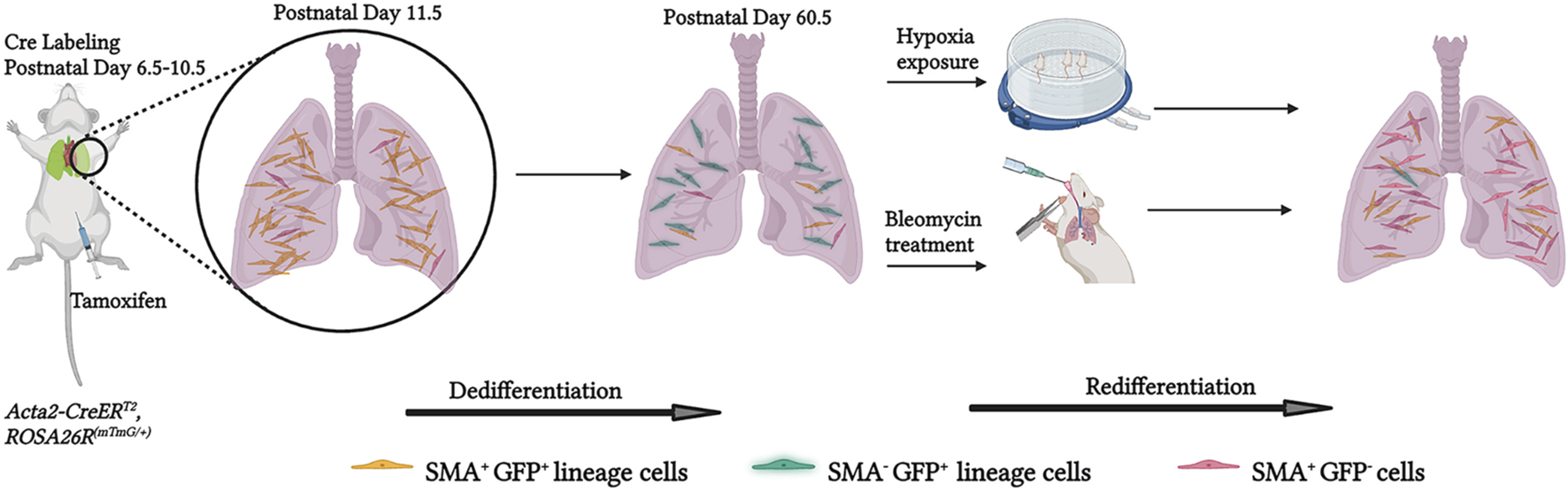 Finally, we speculate that dedifferentiated adult lung cells are specialized to respond to injury. This hypothesis gains support from studies with a pneumonectomy model, in which myofibroblasts have been implicated in playing an important role in re-alveolarization (Bennett et al., 2017; Ysasi et al., 2017). Additionally, as redifferentiated lineage+ cells accumulate in intact lung regions during fibrosis (Figure 5), they likely have a distinct role from that of high collagen-producing myofibroblasts. The significance of this novel cell type that differentiates during adult lung pathologies is yet to be uncovered. A limitation of the study is the lack of mechanistic insights into the role of redifferentiation in pathogenesis of lung disease; however, designing and carrying out experimental studies to define these roles are quite challenging for a number of reasons. For instance, approximately one-third of hypoxia-induced lung myofibroblasts originate from early postnatal dedifferentiated myofibroblasts, and selectively inhibiting redifferentiation of these cells would be very difficult in vivo. In addition, testing this hypothesis in cell culture poses major challenges due to difficulties in both isolation of this rare population of cells and in mimicking the in vivo pathological setting. The lung undergoes extensive remodeling under hypoxic and fibrotic conditions (Huang et al., 2013; Vadivel et al., 2014; Wang and Tang, 2020) and given the expression of genes implicated in tissue remodeling in the dedifferentiated cell cluster by scRNA-seq, it will be important in future studies to elucidate the role of redifferentiated myofibroblasts in lung remodeling post-injury.