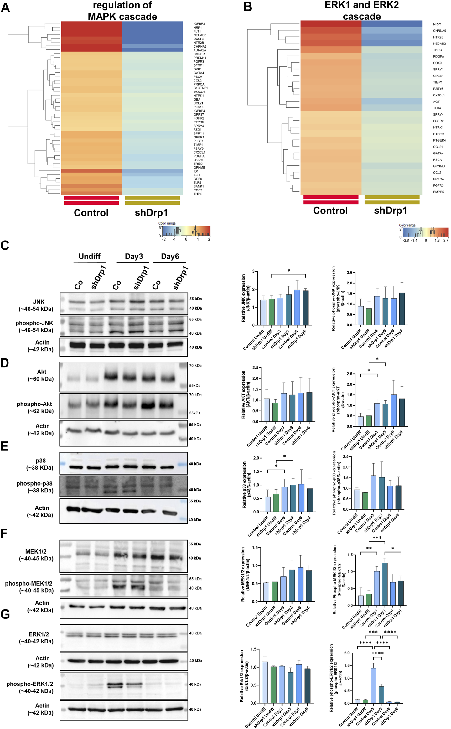 Reduced phosphorylation of ERK1/2 in shDrp1 cells on Days 3 after RA-induced differentiation. Heatmaps represent the expression patterns of genes regulating MAPK cascade GO:0043408 (A) and ERK1 and ERK2 (B) cascade GO:0070371. Heatmaps were generated by a hierarchical clustering algorithm using Ward’s linkage method, and similarity measures were determined by Euclidean distance metric with the StranNGS software. The color range shows the normalized gene expression values on the log2 scale, and the histogram represents the distribution of the genes by their normalized values. The protein- and phosphoprotein levels of members of cellular signaling pathways, including JNK, phospho-JNK (C), Akt, phospho-Akt (D), p38, phospho-p38 (E), MEK1/2, phospho-MEK1/2 (F) and ERK1/2, phospho-ERK1/2 (G) were examined by western blotting in undifferentiated and differentiated (Days 3 and 6) control and shDrp1 cells. Cells were untreated or treated with 10 μM RA for 3 days (0–3) and 50 ng/mL BDNF for the next 3 days (3–6) to achieve neuronal differentiation. Cells were lysed with RIPA buffer, and an equal amount of protein was separated. β-actin was used as an internal loading control. Representative images of western blots are shown. Statistical analyses of the relative protein expressions are shown. Images were taken using a ChemiDoc Imager, and the pixel intensity was quantified and normalized to the internal control, β-actin, using Image Lab software. Data are presented as means ± SD (n = 4). Groups were compared using One-way ANOVA with multiple comparisons. Only significant differences are shown (* indicates p < 0.05, ** indicates p < 0.01, *** indicates p < 0.001, **** indicates p < 0.0001).