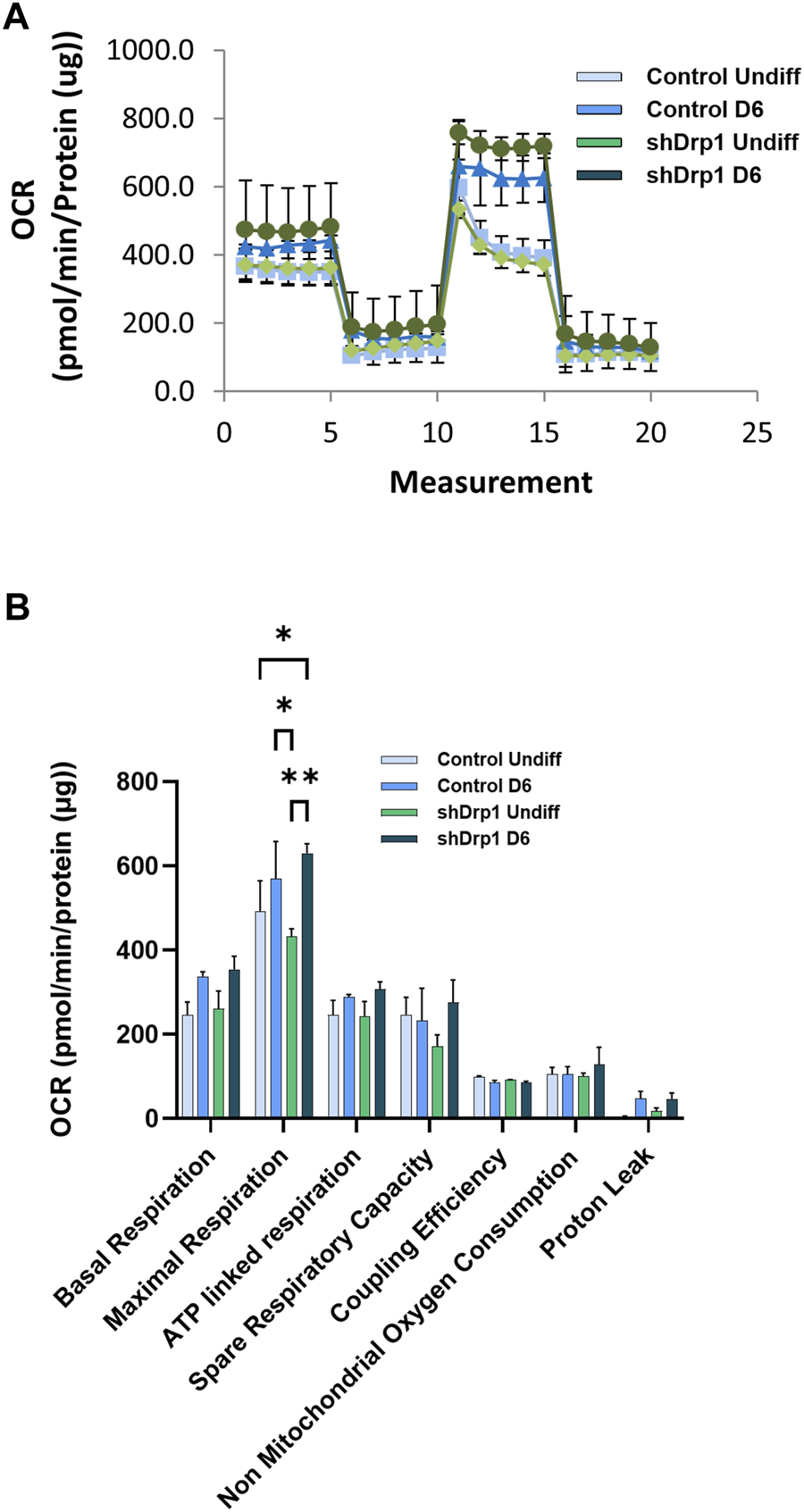 Oxygen consumption rate (OCR) was measured at Days 0 and 6 of control and shDrp1 cells. Cells were seeded in appropriate culture media in XF96 cell culture microplates (Agilent, Seahorse Bioscience) with proper background correction wells and incubated overnight at 37°C in a 5% CO2 incubator. On the following day (Day 0), the media were changed to phase 1 media in cells subjected to phase 1 (days 0–3) and 2 differentiations. On Day 3, the media was replaced with phase 2 media in cells subjected to phase 2 (days 3–6) differentiation. The sensor cartridge was prepared by adding 200 µL of Seahorse Bioscience XF96 calibrant solution (pH, 7.4) (Agilent, Seahorse Bioscience) to each Seahorse Bioscience 96-well utility plate well. The sensors with the calibrant solution were incubated overnight at 37°C without CO2. Measurements were performed using the Seahorse XF96 Analyzer. For XF Cell Mito Stress analysis, the media was replaced with 180 µL of XF assay medium (Agilent, Seahorse Bioscience) supplemented with 2 mΜ L-glutamine and 25 mM glucose on the day of measurement, and the plate was incubated at 37°C without CO2 for 1 h. After a 20-min equilibration time, OCR was measured every 6 min (1 min mixing, 5 min measurement) for five cycles. Mitochondrial inhibitors were applied at the following final concentrations: 1.5 µM oligomycin (O), 1 µM FCCP (F), 1 µM antimycin-A (A), and 1 µM rotenone (R). The OCR values were normalized to the total protein concentration of each well using a quick Bradford protein assay (BIO-RAD). Data were analyzed using a 2.3 Agilent Seahorse Desktop Software. Reports were generated by the Multi-File XF Report Generator (Agilent, Seahorse Bioscience) that automatically calculates assay parameters of the Seahorse XF Cell Mito Stress Test as the average ± S.E.M of the average parameter value of the biological replicate groups.