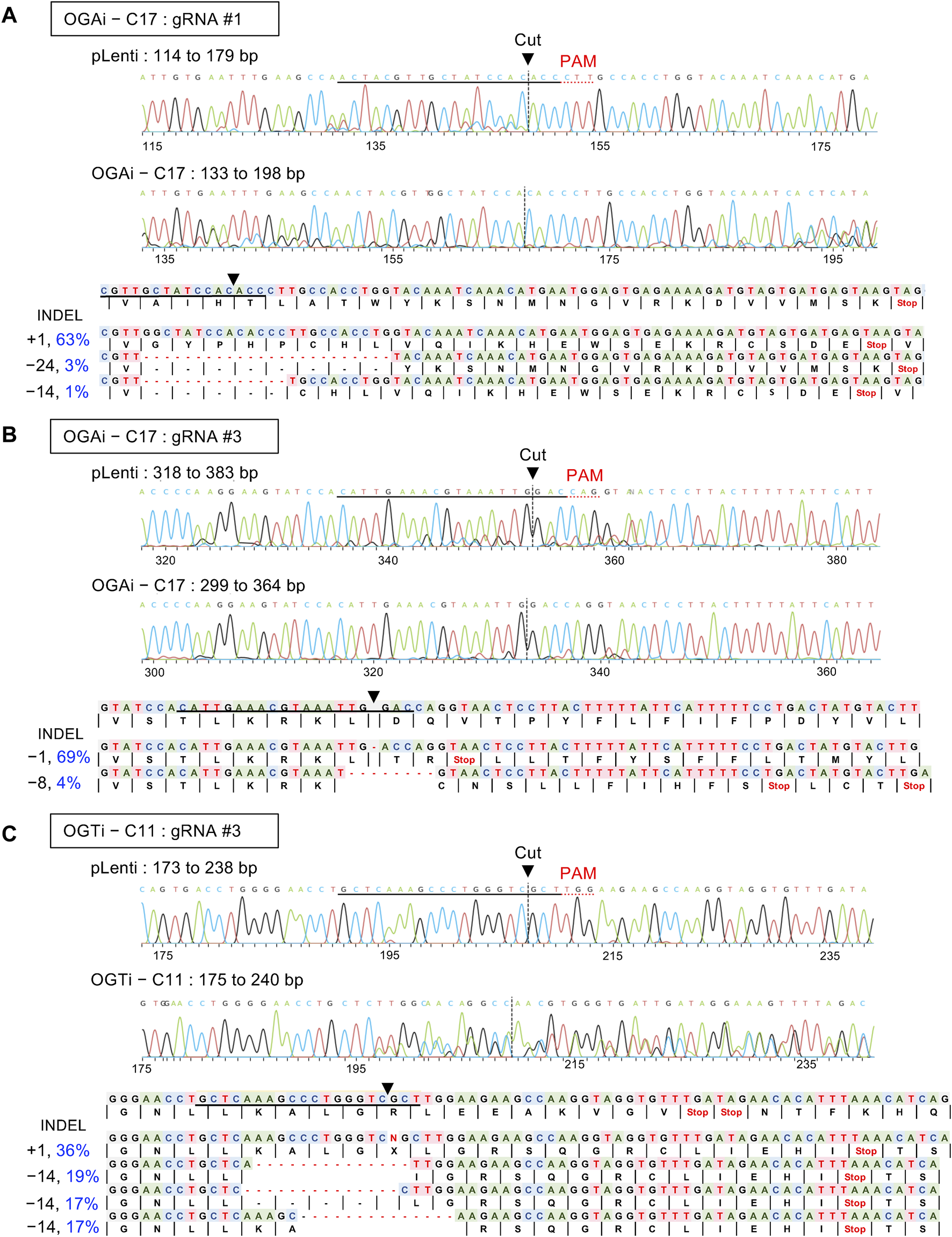 Figure 2. Characterization of INDEL mutations in OGAi and OGTi hiPSCs by DNA sequencing and ICE analysis. (A, B) (upper) DNA sequencing spanning over the Cas9 cut sites on OGA when using gRNA #1 (A) and #3 (B) from CRISPR control (pLenti) hiPSCs in comparison with OGAi–C17 hiPSCs. The gRNA sequence is underlined in black, and the PAM sequence is denoted by a dotted red underline in the control sample. Vertical dotted lines denote the expected cut site. (lower) The inferred sequences of OGA present in OGAi–C17 hiPSCs and their relative proportions (%INDEL) are listed along with the translated amino acids. (C) (upper) DNA sequencing spanning over the Cas9 cut site on OGT when using gRNA #3 from CRISPR control (pLenti) hiPSCs in comparison with OGTi–C11 hiPSCs. (lower) The inferred sequences of OGT present in OGTi–C11 hiPSCs and their relative proportions (%INDEL) are listed along with the translated amino acids.