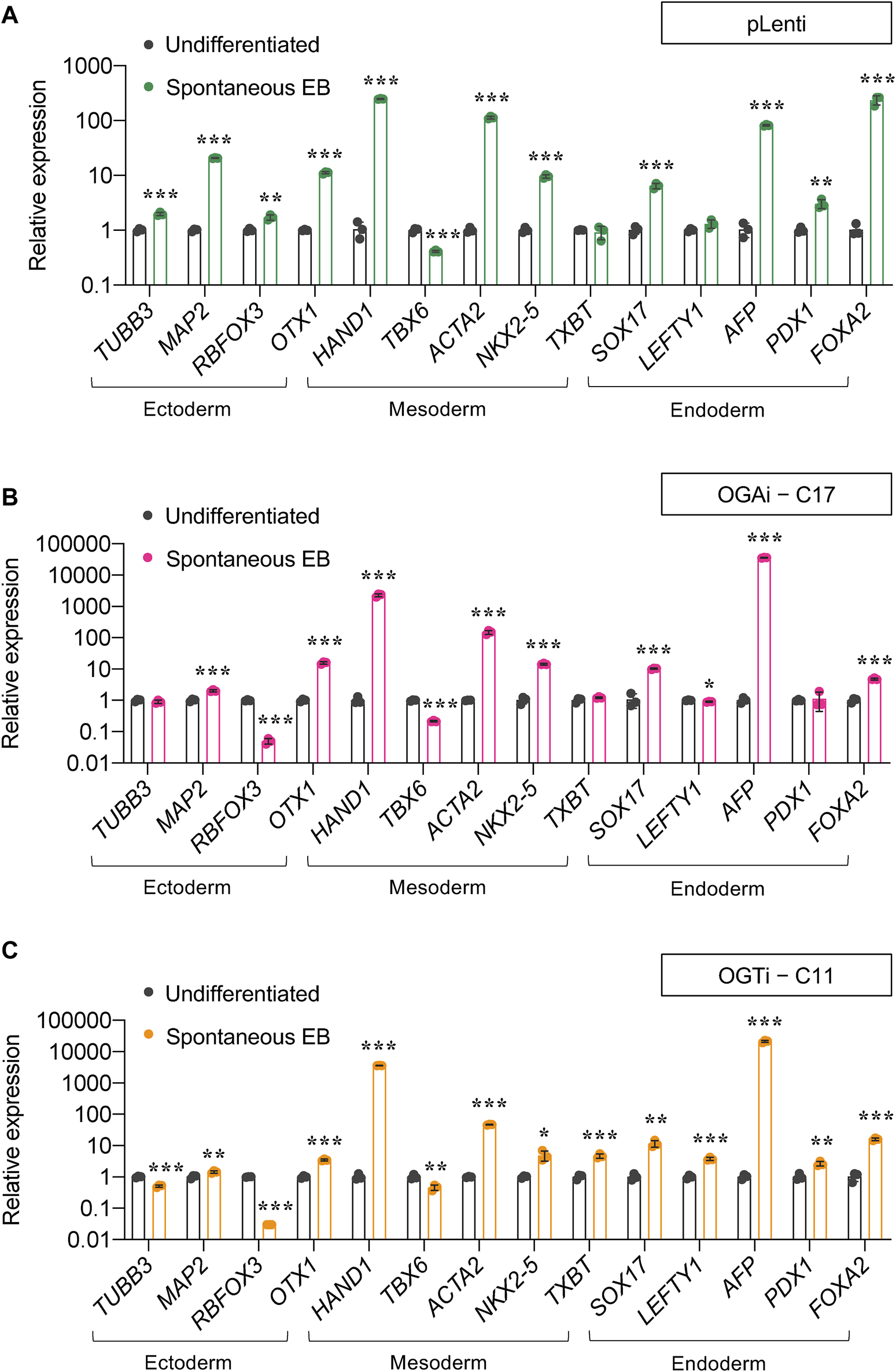 Figure 5. Differentiation potential of OGAi and OGTi hiPSCs as evaluated by spontaneous EB formation. (A–C) mRNA expression of trilineage differentiation markers: TUBB3, MAP2, RBFOX3, and OTX1 for ectoderm; HAND1, TBX6, ACTA2, and TBXT for mesoderm; and SOX17, LEFTY1, AFP, PDX1, and FOXA2 for endoderm in EBs derived from pLenti (A), OGAi–C17 (B), and OGTi–C11 (C) hiPSCs on day 21 of differentiation by qPCR. Data are mean ± SD (n = 3). *p < 0.05, **p < 0.01, ***p < 0.001 versus undifferentiated hiPSCs; unpaired t-test.