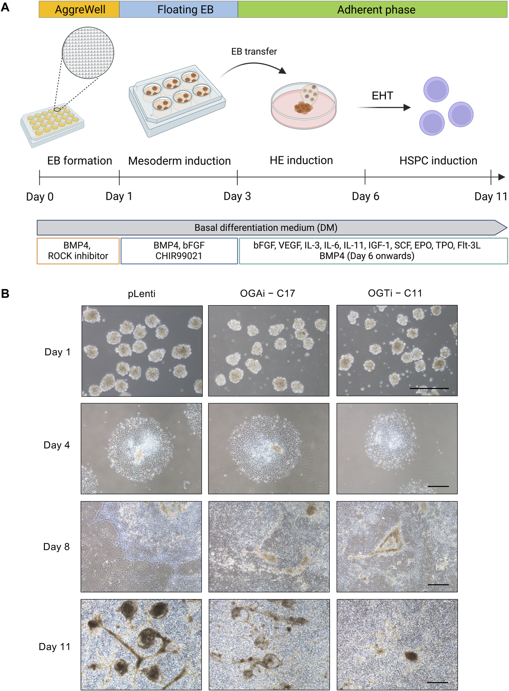 hiPSCs hold great promise for cell-based therapy, including cancer immunotherapy. The differentiation of anti-BCMA CAR-natural killer (NK) cells (FT576) from CD38-knockout hiPSCs that expressed anti-BCMA chimeric antigen receptor (CAR), high-affinity, non-cleavable CD16 (hnCD16), and IL-15/IL-15 receptor fusion protein (IL-15RF) is currently undergoing Phase 1 clinical trial (NCT 05182073) for the treatment of multiple myeloma (Wang X. et al., 2022). Generally, the differentiation of hiPSCs into any specialized blood cells begins with the induction of hiPSCs into mesoderm and hemogenic endothelium (HE) to generate HSPCs, which recapitulates the development of HSCs during hematopoiesis (Pratumkaew et al., 2021; Klaihmon et al., 2023). Herein, we investigated the impact of O-GlcNAcylation on hiPSC commitment to hematopoietic lineage using a differentiation protocol consisting of i) mesoderm induction via AggreWell EB formation and ii) HSPC induction via EHT, as schematically described in Figure 6A. The morphology of adherent EBs on day 4 in a Matrigel-coated plate was considered healthy, as they maintained a round morphology and exhibited continued outgrowth (Figure 6B). On day 8 of culture, the formation of cobblestone areas and round-shaped floating cells were clearly observed. The switch of culture from adherent cells to floating cells is essential for undergoing EHT (Wang N. et al., 2022). Hence, the floating cells were collected on day 8 onwards for further immunophenotypic analyses by flow cytometry.