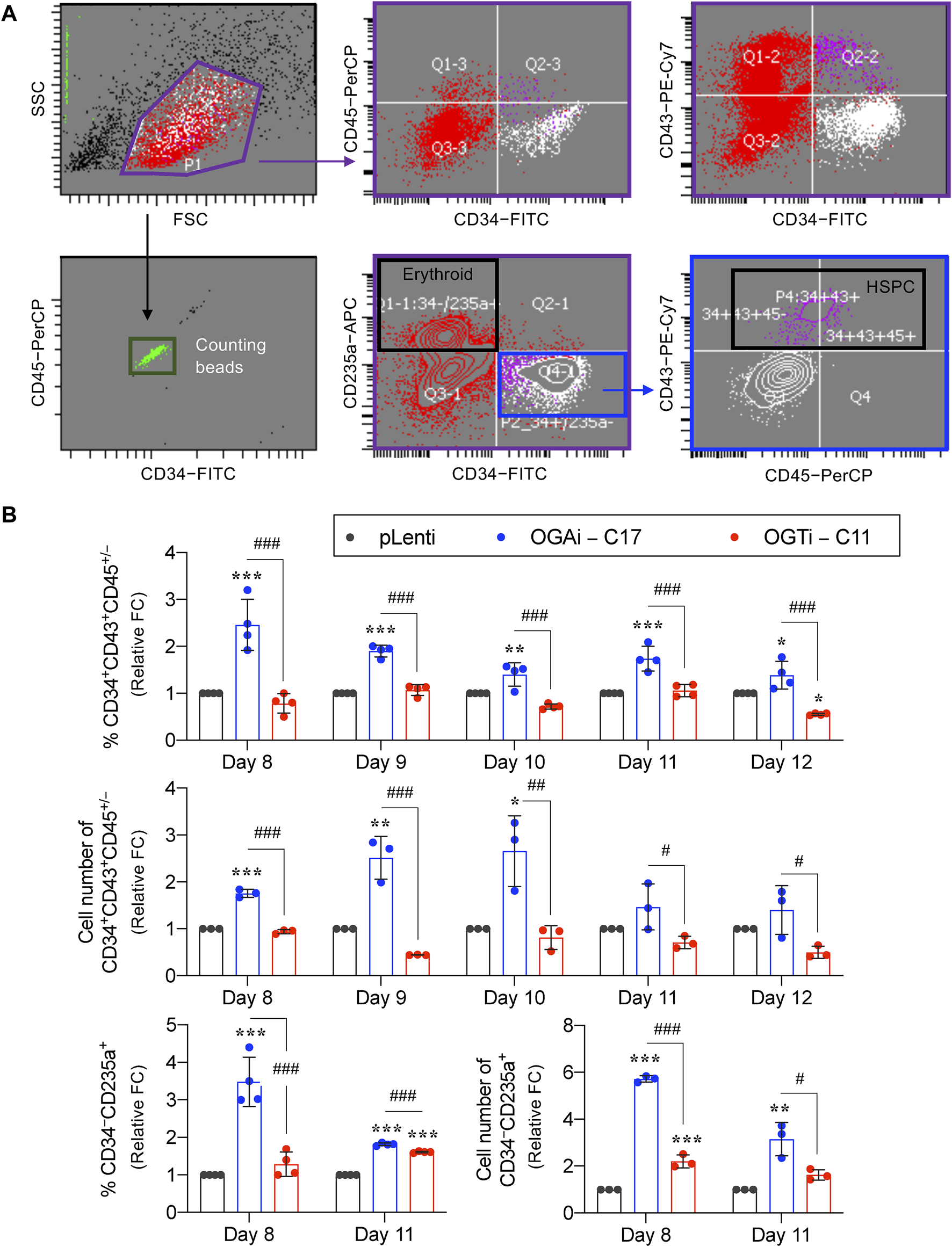 Figure 7. Cellular O-GlcNAcylation affects hiPSC differentiation toward HSPCs. (A) Flow cytometry gating strategy to define floating cells derived from pLenti, OGAi–C17, and OGTi–C11 hiPSCs into CD34+CD43+CD45+/− HSPCs and CD34−CD235a+ erythroid cells. Absolute cell numbers were determined by comparing cell events to counting bead events. (B) Percentage (upper) and cell number (middle) of derived CD34+CD43+CD45+/− HSPCs on days 8–12 of culture. (lower) Percentage and cell number of derived CD34−CD235a+ cells on days 8 and 11 of culture. Due to inter-experimental variations, data are presented as relative fold change (FC) to pLenti control in each experiment. Data are mean ± SD (n = 3 or 4) from at least three independent experiments. *p < 0.05, **p < 0.01, ***p < 0.001 versus pLenti control group; #p < 0.05, ##p < 0.01, ###p < 0.001 versus OGAi group; one-way ANOVA with Tukey’s multiple comparison test. Representative flow cytometry plots can be found in Supplementary Figures S3, S4.
