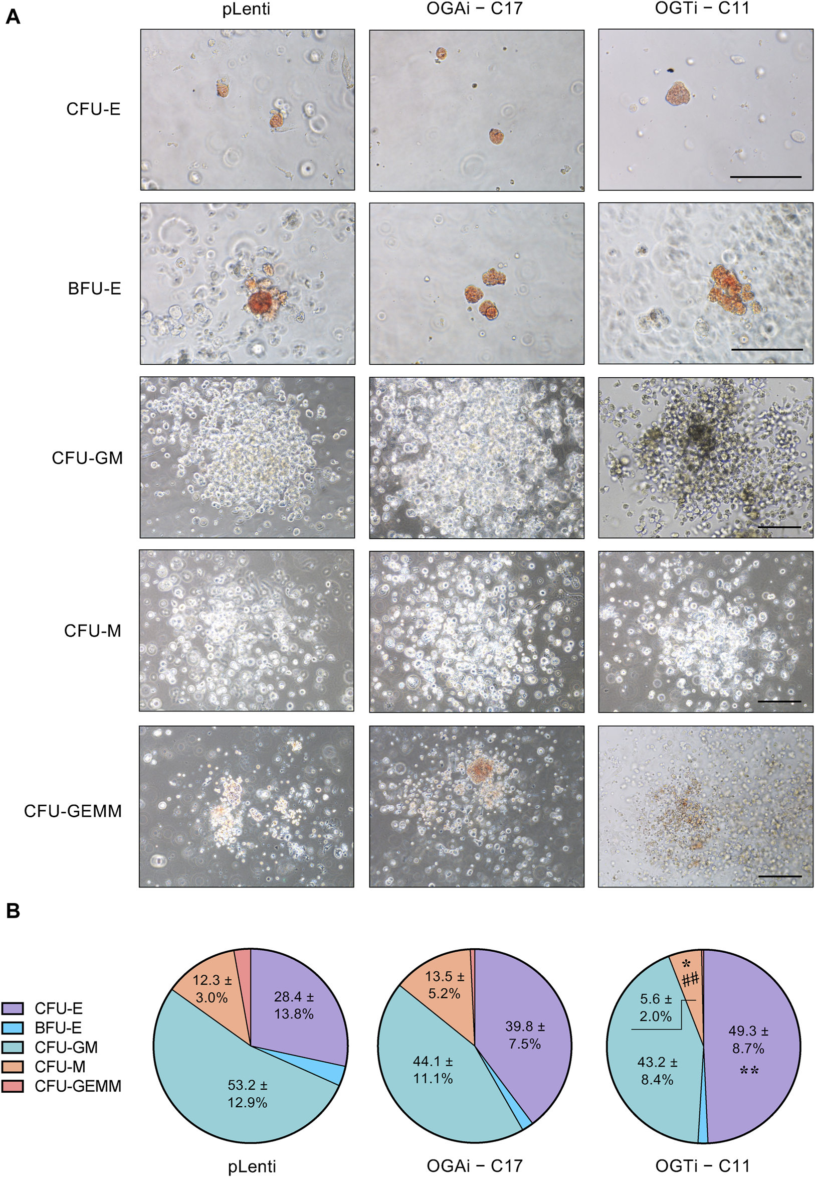 Figure 8. Functional characterization of the differentiated HSPCs from hiPSCs. (A) Representative micrographs of different progenitor cell colonies growing from CFU assay. HSPCs derived from pLenti, OGAi–C17, and OGTi–C11 hiPSCs at day 11 of culture were used. Scale bar = 200 μm. (B) Colonies were scored under an inverted microscope at 14 days of culture and the proportion of each progenitor was plotted. Data are mean ± S.D. (n = 6) from six independent experiments. *p < 0.05, **p < 0.01 versus pLenti control group; ##p < 0.01 versus OGAi group; one-way ANOVA with Tukey’s multiple comparison test. See also Supplementary Table S3 for average number of CFU colonies counted.