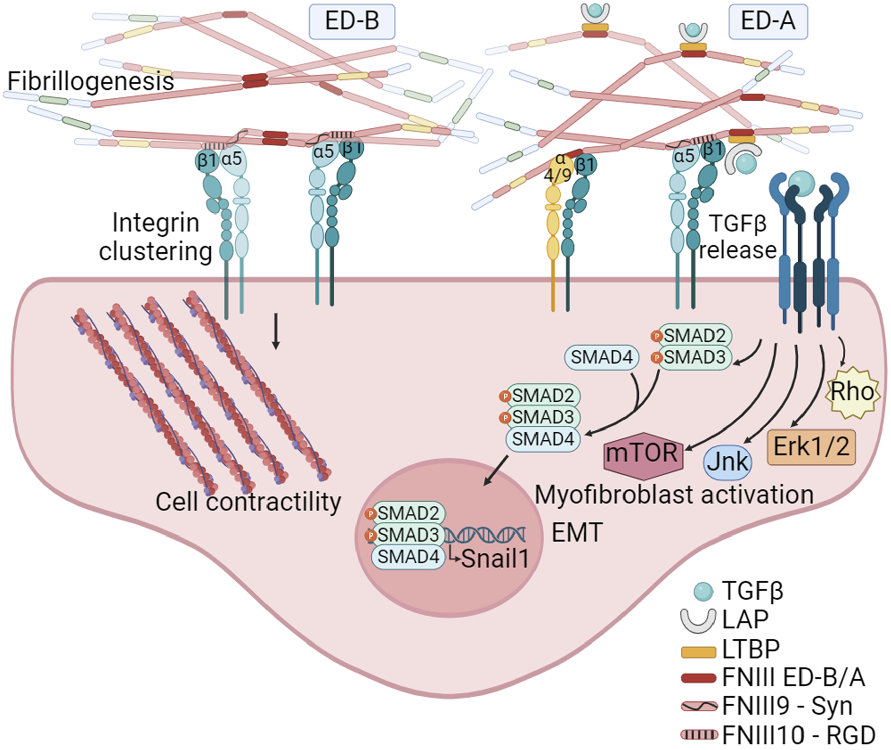 Figure 4. The FN isoforms generated by alternative splicing can impact on FN fibrillogenesis. The inclusion of the ED-B, located between FNIII7 and III8 modules, facilitates the formation of tightly packed head-to-tail homodimers. This structural arrangement promotes simultaneous access to the synergy and RGD motifs on FN, leading to the clustering of integrins, and thus to FN fibril formation and mechanosignaling. The inclusion of ED-A, between FNIII11 and III12 modules, in addition to facilitate fibrillogenesis, also provides specific binding sites to α4β1 and α9β1 integrins expressed by hematopoietic cells. Moreover, ED-A offers a binding site for the LTBP-1. The interaction with LTBP allows for the storage, and TGFβ1 release and signaling under conditions of fibril strengthening or proteolytic degradation. Created with BioRender.com.