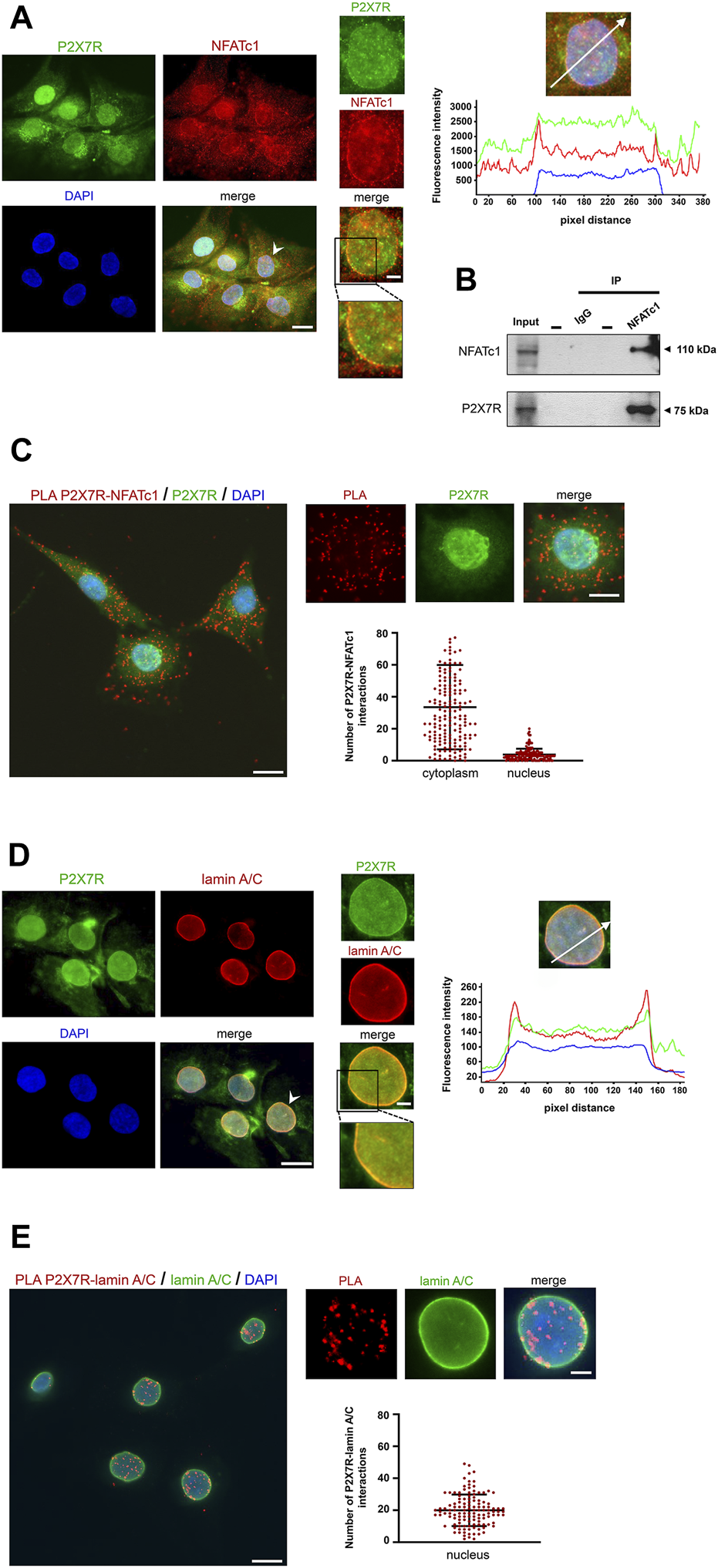 In situ proximity ligation assay (PLA) was performed using Duolink®In Situ Orange Starter Kit Mouse/Rabbit (# DUO92102, Sigma-Aldrich, Merck KGaA). Cells were seeded on glass coverslips, put into 24-well plates at a density of 20,000 cells/well, and fixed in 100% methanol for 7 min at RT. After washes, the cells were blocked with 4% BSA/PBS 1× and incubated with the following primary antibodies: anti-NFATc1 (1:10, # sc-7294) overnight at 4°C, anti-P2X7R (1:300, #P8232) and anti-lamin A/C (1:3000, # sc-376248) 1 h at RT. Thereafter, the cells were incubated for 1 h at 37°C with secondary probes diluted to a final concentration of 1:5. Ligation solution was added to each sample and incubated in a humidity chamber for 30 min at 37°C. Later, the ligation solution was removed with wash buffer A, and an amplification solution was added and incubated in a humidity chamber for 100 min at 37°C. After washes, Duolink in situ mounting medium with DAPI was added, and the samples were observed using a Nikon Eclipse Ni fluorescence microscope equipped with a digital CCD camera and NIS Elements AR 4.3 software. Quantitative analysis of the PLA results was performed using Duolink ImageTool software (Sigma-Aldrich) by counting 100 cells or nuclei per sample.
