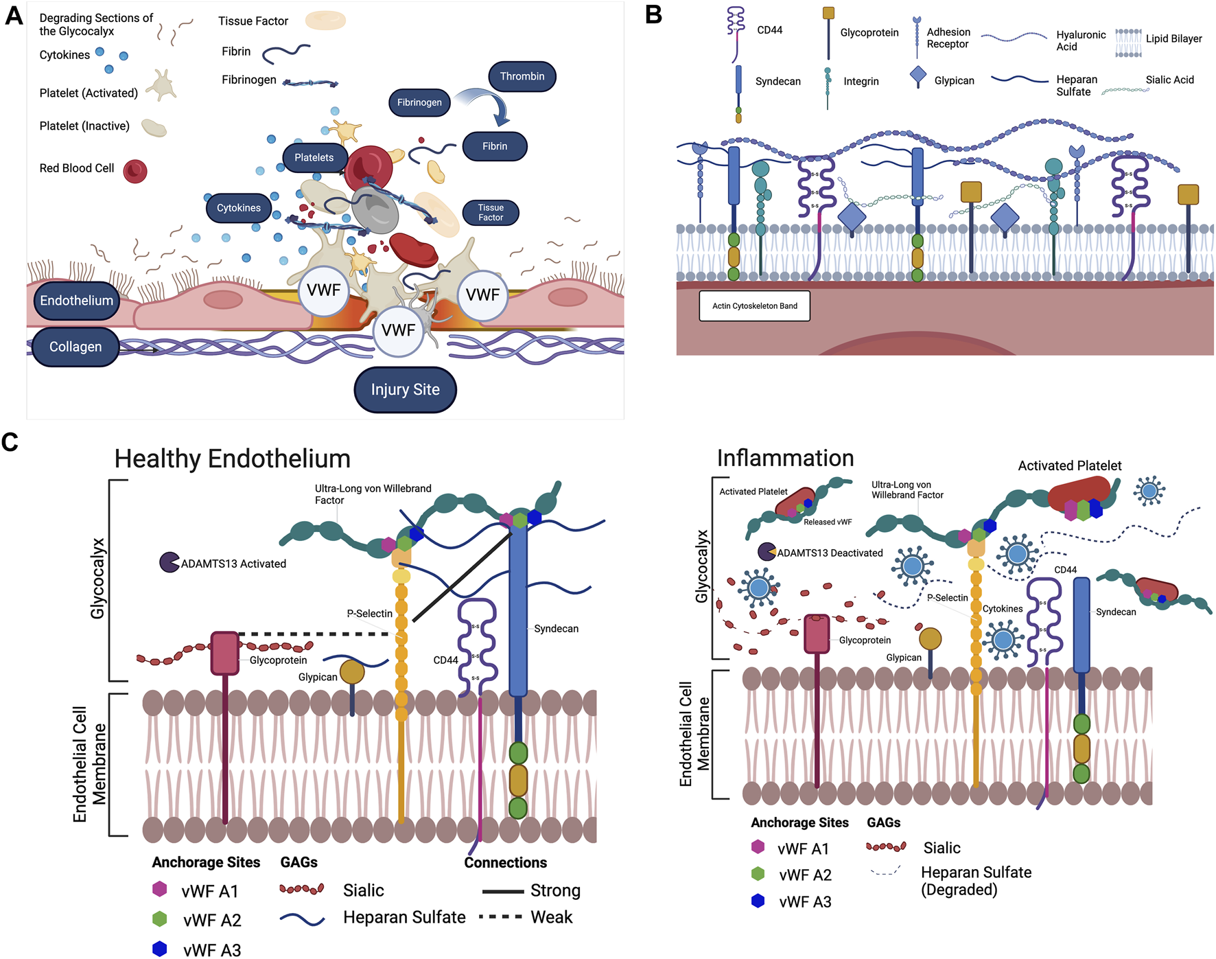 (A) The extrinsic pathway begins with Tissue Factor. Tissue Factor is primarily expressed in the walls of blood vessels. When the vessel wall is damaged, a large amount of Tissue Factor enters the blood. Tissue Factor combines with present proconvertin (Factor VII) to form the activated complex TF: FVIIa (Owens and Mackman, 2010; Neubauer and Zieger, 2022). TF: FVIIa activates Stuart-Power Factor (Factor X) and Factor VIII (O’Donnell et al., 2019). The extrinsic pathway can be terminated by tissue Factor pathway inhibitor, which inhibits the TF: FVIIa complex (Owens and Mackman, 2010). The intrinsic pathway begins with high molecular weight kininogen. Factor XV activates Hageman Factor. Factor XIIa combines with coFactors to activate Factor XI (Palta et al., 2014). Factor XI activates Factor IX. Factor IX activates Factor VIII. Factor IX and Factor VIII form a complex on the platelet phospholipids that activates Factor X (Owens and Mackman, 2010). In the common pathway, activated Stuart-Prower Factor (Factor Xa) and Factor Va form a prothrombinase complex with platelet phospholipids. Prothrombinase cleaves Prothrombin (Factor II) into Thrombin. Thrombin cleaves Fibrinogen (Factor I) into Fibrin (Owens 3rd and Mackman, 2010). Thrombin activates Factor XIII. Factor XIII crosslinks Fibrin into a polymer with covalent bonds. The platelets and Fibrin polymers form the haemostatic clot (Palta et al., 2014). To position the clot in the correct location, Von Willebrand Factor (Factor XVI) binds to collagen exposed by the injury to the vessel epithelium (Neubauer and Zieger, 2022). The Von Willebrand Factor then binds to the GPIb-IX-V complex on the platelet membrane, positioning the platelets and fibrin of the clot at the site of the injury (Sang et al., 2021). In recent years, the glycocalyx has been proposed to potentially play an important role in the anchoring of clotting Factors, and its well documented degradation in inflammatory states has been proposed as an underlying Factor for excessive clot development. Created with BioRender.com. (B) The endothelial glycocalyx and the GAGs that are present in the endothelial glycocalyx. Heparan sulfate, attached to the syndecan complex, hyaluronic acid and sialic acid and the glypican complex are the main components of the glycocalyx, which lines the endothelium (Mensah et al., 2021). Created with BioRender.com. (A–C) The endothelial glycocalyx during both inflammatory and healthy conditions. As shown, when cytokines are present to degrade sialic acid and heparan sulfate, the only known component anchoring the ULVWF to the endothelial membrane is P-Selectin, however much is unknown about the interactions of Sialic Acid, Heparan Sulfate and Hyaluronic Acid separately as anchors to the ULVWF. Each component must be separately stained to visualize and uncover these interactions in inflammatory conditions (Mensah et al., 2021). Created with BioRender.com.