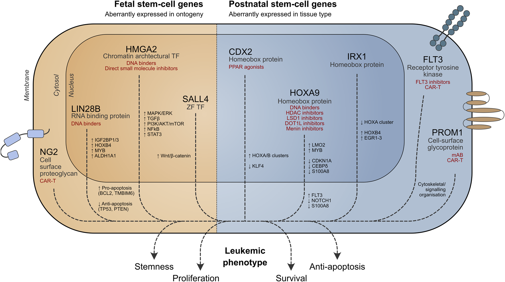 | Fetal and adult HSCs | Drives self-renewal and differentiation block | Clinical: HDAC inhibitors (abexinostat and pracinostat); LSD1 inhibitors (bomedemstat); and DOT1L inhibitors (pinometostat); menin inhibitors (revumenib) | |||