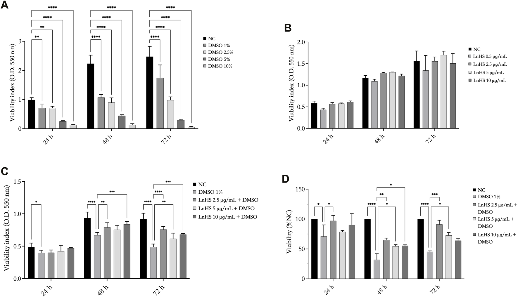 DMSO reduces the viability of SH-SY5Y cells, while LnHS partially attenuates such cytotoxic effect. Cell viability was assessed using MTT assay after exposure to (A) DMSO (1%, 2.5%, 5%, and 10% v/v), (B) LnHS (0.5, 2.5, 5, and 10 μg/mL), and (C) combination of both compounds (1% DMSO and 5–10 μg/mL LnHS) for 24, 48, and 72 h. (D) The percentage of viability was also calculated using the trypan blue assay after 24, 48 and 72 h of the treatments reported above. Values are expressed as the mean of two different experiments performed in triplicate ±SD. NC: untreated cells. The statistical analysis was evaluated using the two-way ANOVA test. *p-value <0.05; **p-value <0.01; ***p-value <0.001 ****p-value <0.0001.