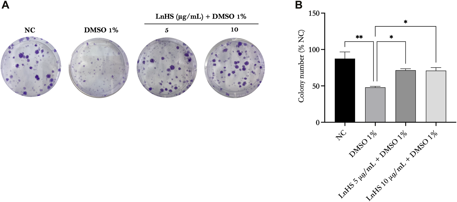 DMSO impairs colony formation in SH-SY5Y cells, while LnHS co-administration restores it. SH-SY5Y cells were exposed to 1% DMSO or a combination of 1% DMSO and LnHS (5 and 10 μg/mL) for 14 days and assessed for colony formation. (A) Representative images of colonies after the above-described treatment. (B) The number of colonies per well was counted and presented as the mean ± SD of two independent experiments performed in triplicate. NC: untreated cells. The statistical analysis was evaluated using the one-way ANOVA test. *p-value <0.05; **p-value <0.01 vs. DMSO.