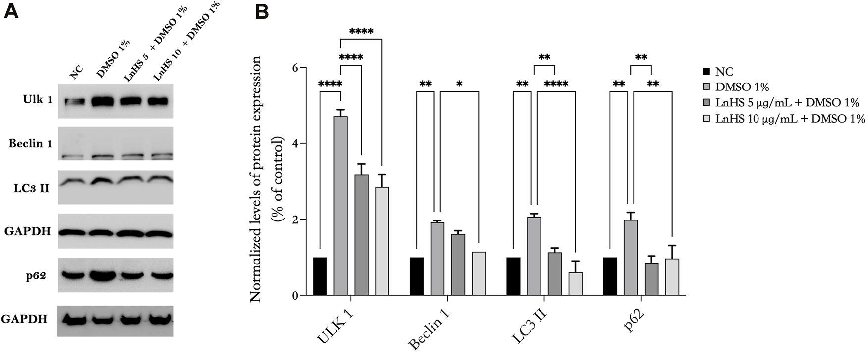 To further explore the underlying molecular mechanisms of DMSO-induced cell toxicity and the effects of LnHS combined treatment, we analyzed, by Western blot, some key proteins involved in autophagy process. Our results demonstrated that SH-SY5Y neuronal cells exposed to 1% DMSO for 48 h exhibited significant upregulation in the expression of some autophagic proteins such as Ulk-1, Beclin-1, LC3 II, and p62 (see Figure 3). Remarkably, the co-administration of LnHS, even at a dose as low as 5 μg/mL, attenuated the upregulation effect on all tested proteins, as revealed by the Western blot analysis (see Figure 3). These findings highlight the potential efficacy of LnHS in ameliorating DMSO-induced dysregulation of autophagy in neuronal cells.