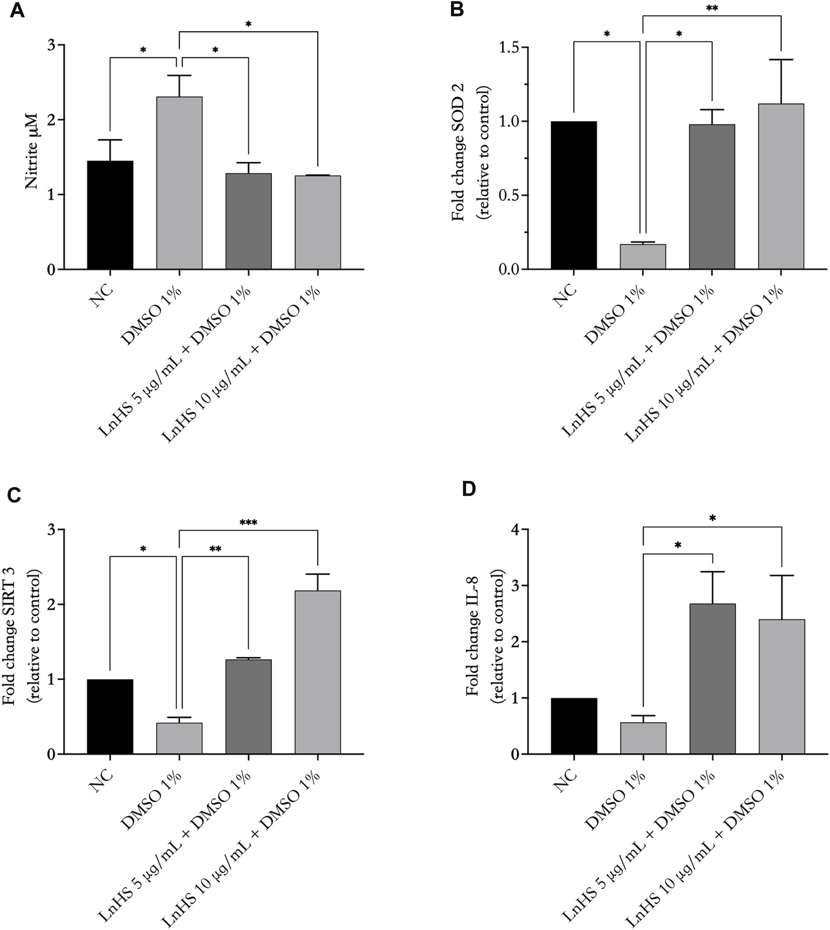 LnHS modulates DMSO-induced oxidative stress and IL-8 expression in SH-SY5Y cells. The levels of NO, SIRT3, SOD2 and IL-8 in SH-SY5Y cells were measured after 48 h of DMSO and LnHS administration. (A) DMSO administration significantly promoted NO production in SH-SY5Y cells, whereas LnHS significantly attenuates this effect. (B) DMSO significantly reduces the expression of SIRT3 and (C) SOD2 expression whereas LnHS restores their levels in SH-SY5Y cells. (D) DMSO treatment reduced IL-8 expression levels, whereas the co-administration with LnHS enhanced it. Values are expressed as the mean of two different experiments performed in triplicate ±SD. NC: untreated cells. The statistical analysis was evaluated using the one-way ANOVA test. *p-value <0.05; **p-value <0.01; ***p-value <0.001 vs. DMSO.