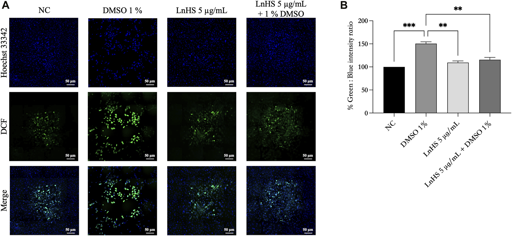 DMSO promotes ROS generation in SH-SY5Y cells, while LnHS co-administration attenuates it. (A) Representative fluorescence micrographs depicting ROS generation in SH-SY5Y cells after treatment with DMSO (1%) and/or LnHS (5 μg/mL) for 48 h. Scale bar is 50 μm (B) % of green DCFDA positive cells over total (Hoechst 33342 stained) number of cells were calculated and presented as the mean ± SD of two independent experiments performed in triplicate. NC: untreated cells. The statistical analysis was evaluated using the one-way ANOVA test. **p-value <0.01; ***p-value <0.001 vs. DMSO.