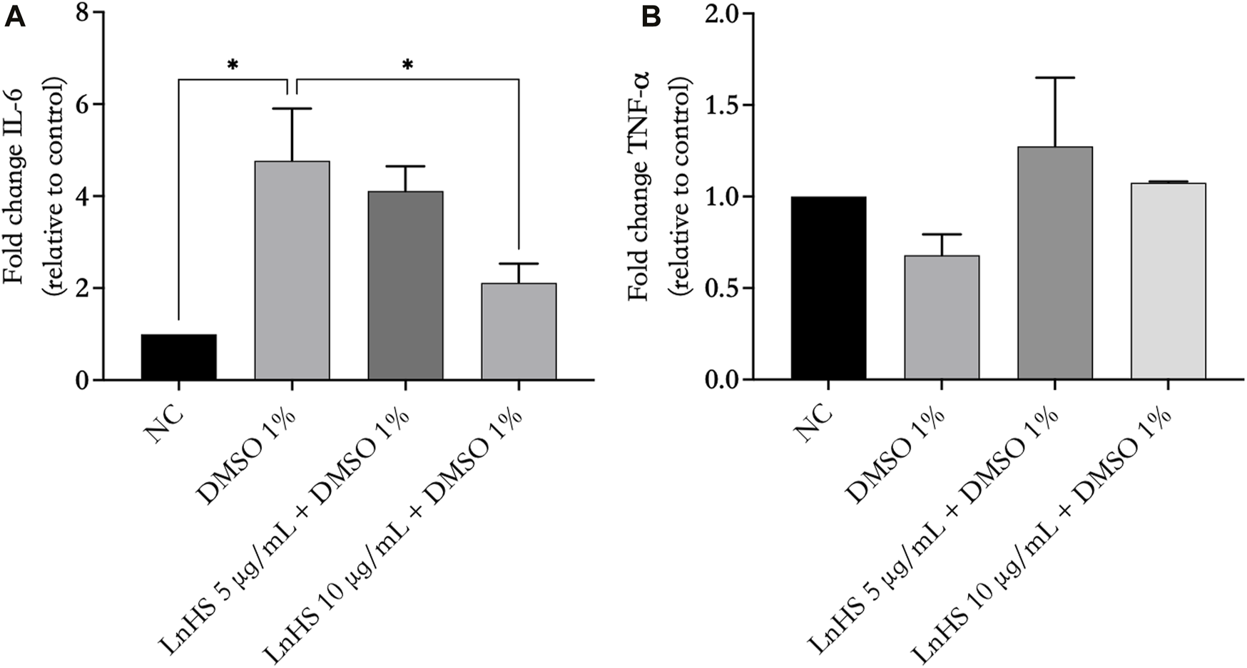LnHS counteracts DMSO-induced effects on IL-6 mRNA levels, while neither DMSO nor LnHS modulates TNF-α mRNA levels. IL-6 and TNF-α mRNA levels were evaluated after 48 h of DMSO and LnHS administration. (A) DMSO administration significantly enhanced IL-6 mRNA expression levels in SH-SY5Y cells, whereas in the co-treatment LnHS attenuates this effect. (B) DMSO alone or in combination with LnHS did not induce any changes in TNF-α levels. Values are expressed as the mean of two different experiments performed in triplicate ±SD. NC: untreated cells. The statistical analysis was evaluated using the one-way ANOVA test. *p-value <0.05 vs. DMSO.