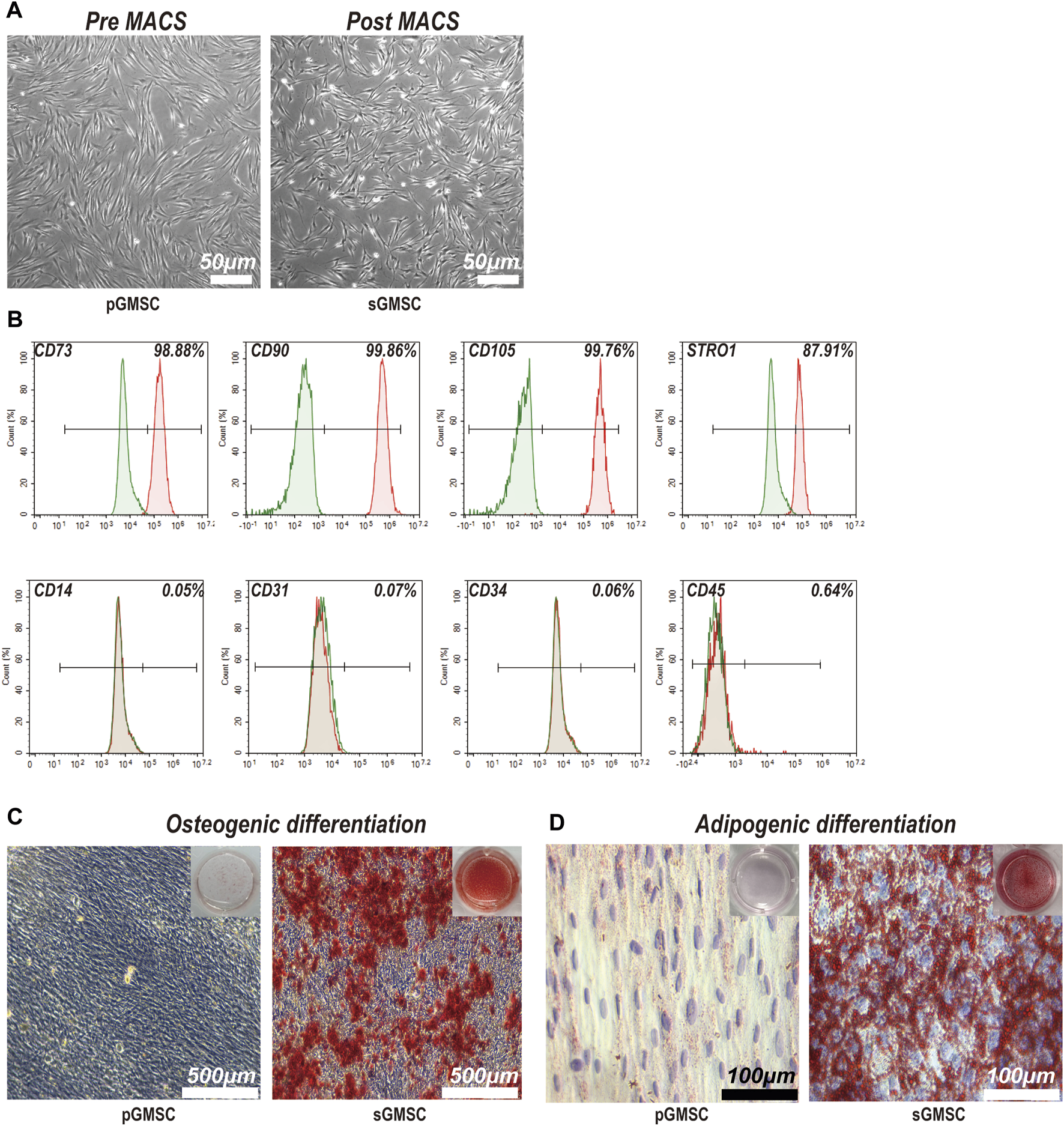 Characterization and differentiation capacities of sGMSCs. (A). Scale bar, 50 μm) pGMSCs and sGMSCs. (B) Expression of surface markers on sGMSCs. (C). Scale bar, 500 μm) Alizarin Red S staining of pGMSCs and sGMSCs for osteogenic differentiation. (D). Scale bar, 100 μm) Oil Red O staining of pGMSCs and sGMSCs for adipogenic differentiation.