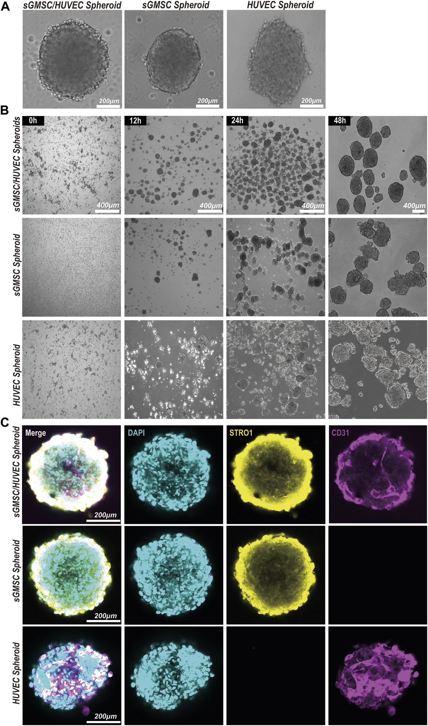 Construction and morphology of GHS. (A). Scale bar, 200 μm) Morphology of GS, HS, and GHS. (B). Scale bar, 400 μm) GHS, GS, and HS formed mature and regular spheroids within 48 h of co-culturing. (C). Scale bar, 200 μm) Immunofluorescence staining of cell-specific markers on day 7 of osteogenic induction. DAPI staining for nuclei (blue), STRO1 staining for sGMSCs (yellow), and CD31 staining for HUVECs (magenta) are shown.