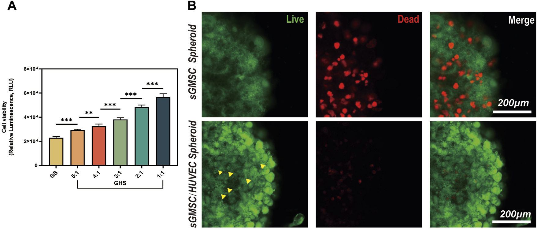 HUVECs promote cell viability and maintain the stability of the GHS system. (A) Osteogenic induction of GHS with different cell ratios on day 7. (Student’s two-tailed unpaired t-test, *p < 0.05, **p < 0.01, ***p < 0.001). (B). Scale bar, 200 μm) Local magnification of Live/Dead cell staining on day 7 of GS and GHS osteogenic induction (green: live cells; red: dead cells; yellow triangles: dot-like dead cells).