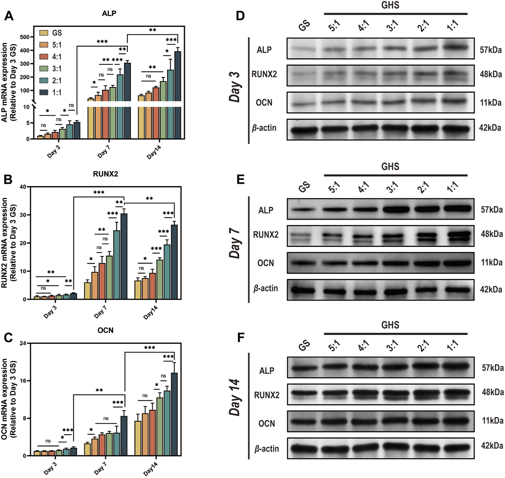 After 3, 7, and 14 days of osteogenic induction, the mRNA and protein expression levels of each cell proportion group within the GHS system were significantly upregulated compared with the GS group, demonstrating statistical significance. Regarding the induction duration, as the osteogenic induction period prolonged, the mRNA and protein expression levels of the early osteogenic differentiation marker ALP and late osteogenic differentiation marker OCN exhibited significant increases. Specifically, on day 14, the mRNA expression levels of ALP and OCN were higher relative to days 3 and 7 (Figures 6A, C), with the protein expression levels showing a consistent trend with mRNA (Figures 6D–F). While the relative mRNA expression of the early osteogenic differentiation marker RUNX2 peaked on day 7 (Figure 6B). From the perspective of cell ratio within the GHS, on day 3 of osteogenic induction, the difference in osteogenic differentiation marker expression between the GS and GHS groups of each cell ratio was not prominent, particularly when the proportion of HUVECs cells was low (e.g., GHR of 5:1, 4:1, and 3:1). However, with higher HUVECs proportions, expression levels of the osteogenic marker were significantly higher than those of the GS group. Moreover, as the proportion of HUVECs within the GHS system increased, the expression levels of ALP, RUNX2, and OCN correspondingly increased with prolonged induction time. These results imply that co-culturing HUVECs with sGMSCs could enhance the osteogenic differentiation capacity of sGMSCs within the GHS system.