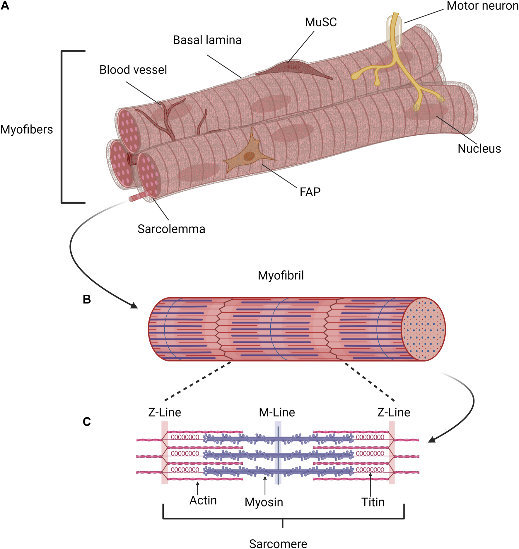 Schematic of the structure of skeletal muscle. (A) Myofibers, connective tissue, blood vessels, muscle stem cells (MuSCs), and various support cell types, such as fibrogenic adipogenic progenitor cells (FAPs), are found in skeletal muscle. Motor neurons innervate the multinucleated myofibers, enabling coordinated movement. The postmitotic myofiber is the primary cell type in skeletal muscle, responsible for force production and muscular contraction. (B) Each myofiber contains several parallel myofibrils, composed of repeating contractile units, the sarcomeres. (C) Muscle contraction is mediated by the sarcomere, the smallest contractile unit formed by overlapping elastic, thick, and thin filaments. Created with BioRender.com.