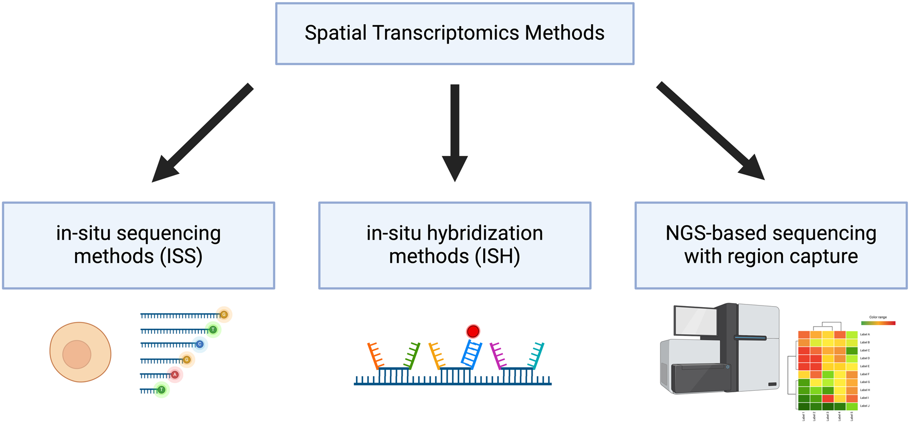 Classification of Spatial Transcriptomics Methods Spatial transcriptomic methods can be categorized into in situ sequencing methods (ISS), in situ hybridization methods (ISH) and next-generation sequencing (NGS)-based sequencing with region capture. Created with BioRender.com.