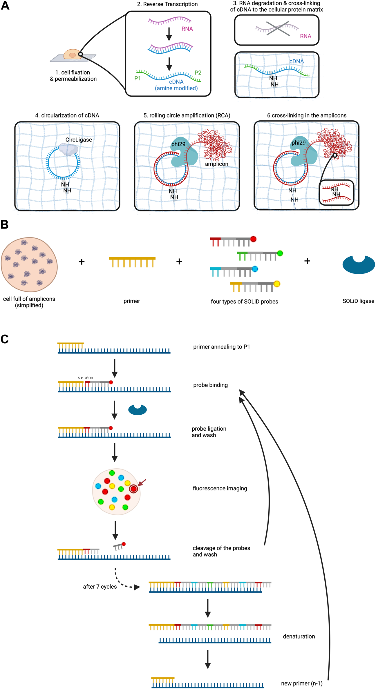 After fixation and permeabilization of the cells, the method involves reverse transcription of the RNA to cDNA within the cell, accompanied by the addition of aminoallyl dUTP molecules which incorporate into the cDNA (Lee et al., 2015). Subsequently, critical adaptors needed for the later sequencing step are ligated to the ends of the cDNAs. A chemical reaction then cross-links the cDNA template to the protein matrix of the cell to prevent locational change due to diffusion. RNA degradation follows to remove competitive inhibitors of CircLigase, an enzyme catalyzing the ligation of single stranded DNA into circles.