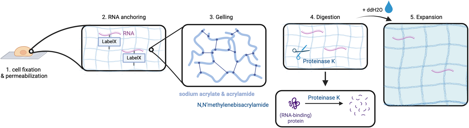 Expansion in ExSEQ. After fixing and permeabilizing the cell (1) RNA anchoring: cellular biomolecules including RNA are labeled for later anchoring to the gel, which is achieved by covalently binding the LabelX to the RNA and the protein matrix (2). The cell is placed in a gel chamber, in order for the gelling solution to polymerize (3). Proteinase K cleaves the protein matrix of the cell into pieces (4) that can then spread isotropically after the addition of water, depicted as a light blue background in (6). Created with BioRender.com.