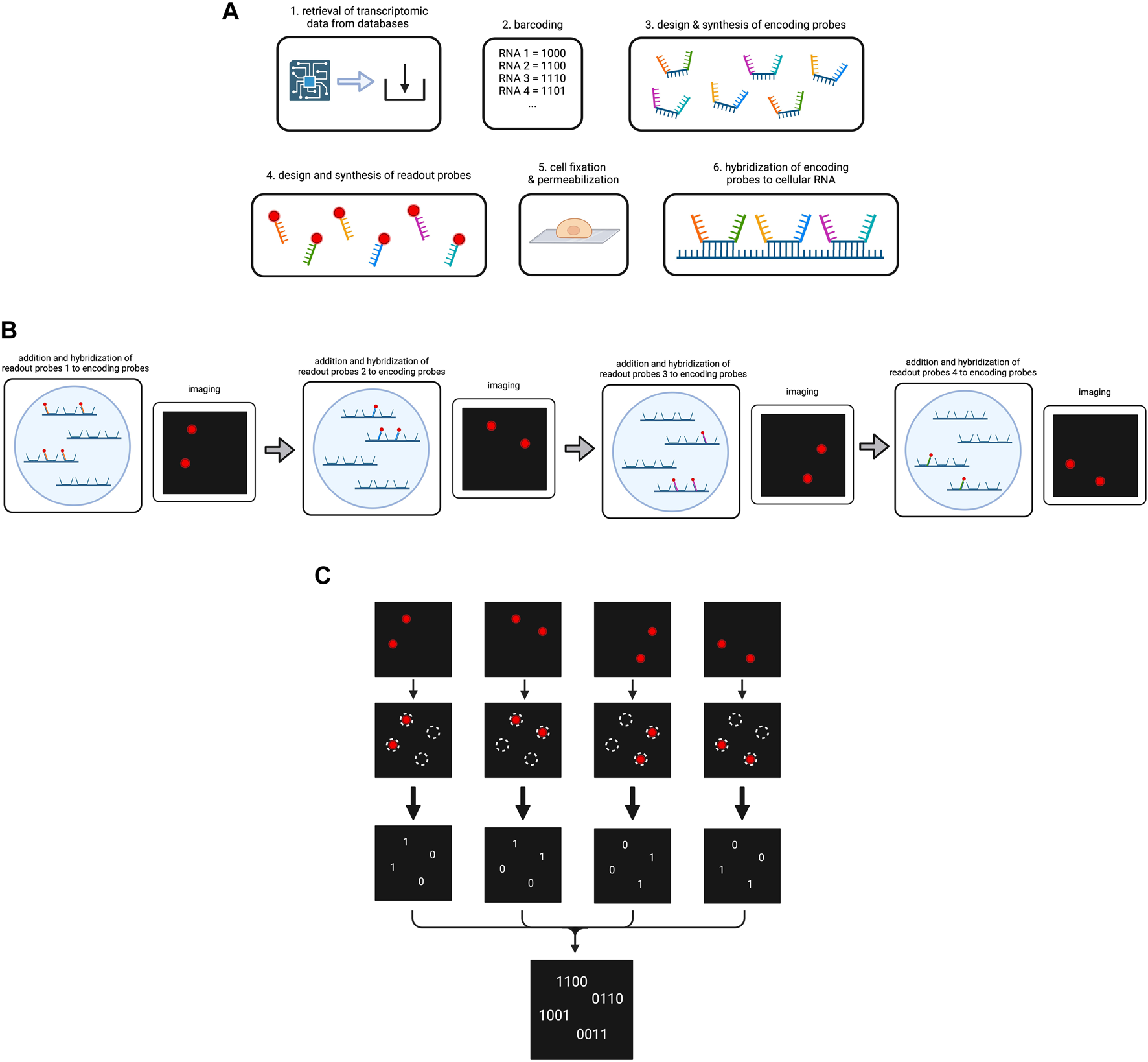 Overview on the MERFISH method. (A) Preparation of the cellular RNA library. Targeted RNA types are determined and encoded by a barcode each. The encoding probes and readout probes are designed and synthesized. After cell fixation and permeabilization encoding probes are added to the cells, so they hybridize to the cellular RNA. (B) Simplified scheme of the operating principle of MERFISH cycles. For the purpose of simplification, our cell contains four RNAs that have been hybridized to encoding probes. We use four different readout probes in four MERFISH cycles. In each cycle a different type of readout probe is added which hybridizes to the respective readout sequences on the encoding probes. After hybridization, imaging occurs and shows the RNAs that have bound to the respective readout probe. The fluorescence is then removed for the next cycle to start. (C) Decoding of the MERFISH images. The single images from each MERFISH cycle are analyzed to determine the spots in which targeted RNAs are located. A present or lacking fluorescent signal in the respective spot is transformed into the bits 1 or 0. Combining the bits from each MERFISH cycle, the binary code is obtained that indicates which RNA type is located in the respective spot. Created with BioRender.com.