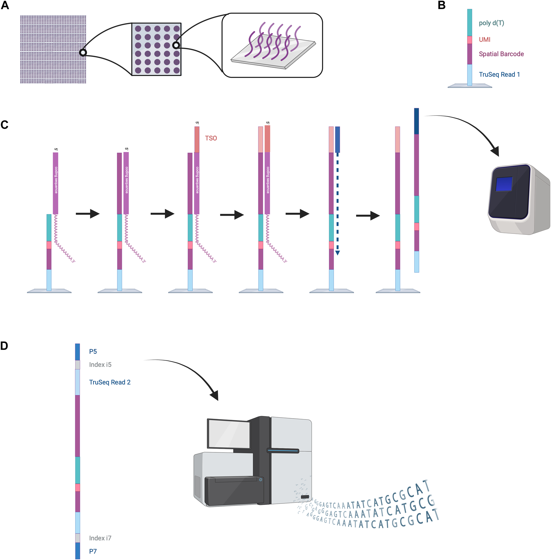 NGS-based sequencing with region capture by the VISIUM platform. (A) A capture area consists of 5,000 small spots in which capture probes are fixed to the bottom of the wells. (B) Structure of the capture probes. (C) mRNAs are captured inside the spots by the capture probes. Reverse transcription is performed, and second strand synthesis provides cDNA that is then amplified by PCR. (D) Amplified oligonucleotides are prepared for Illumina sequencing by the attachment of various oligonucleotides (TruSeq Read two sequence, indices, P5 and P7). These can be processed by the Illumina sequencer to read out the spatial barcode and UMI for spatial mapping and the RNA coding sequences for RNA identification. This data enables reconstruction of the cellular RNA map. Created with BioRender.com.