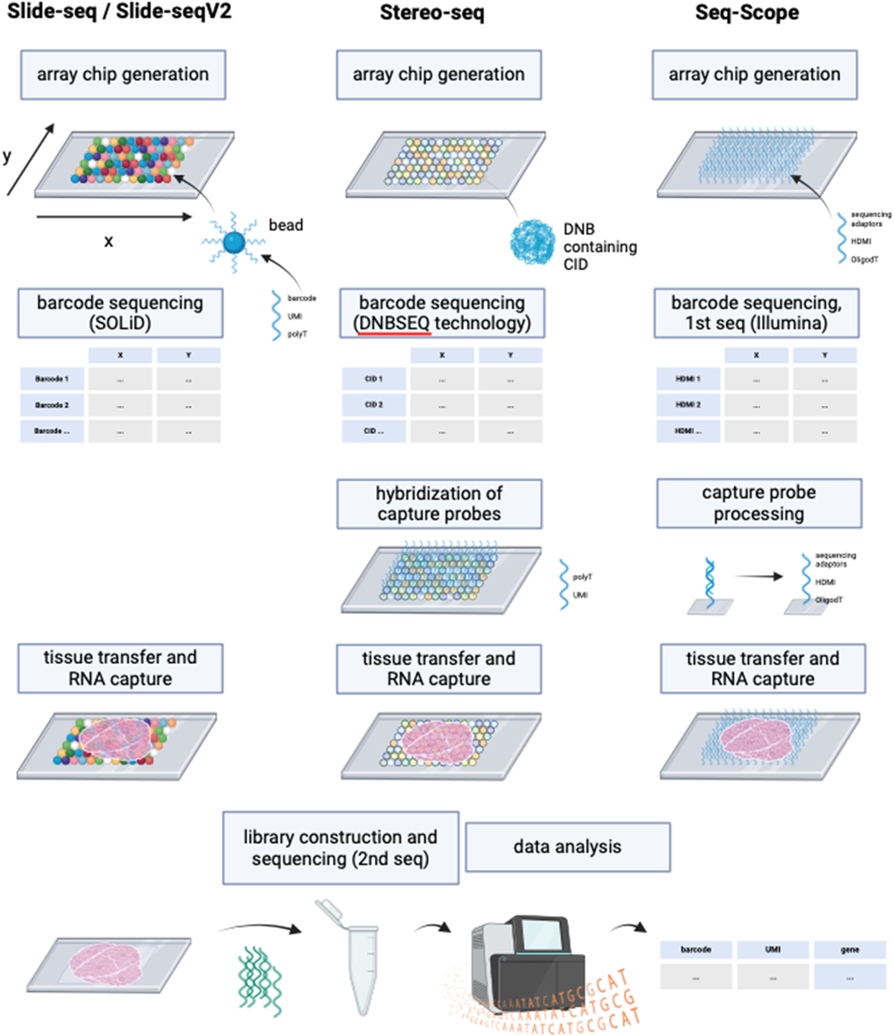 Schematic representation of the working principles of Slide-seq/Slide-seqV2, Stereo-seq and Seq-Scope. Although deploying different technologies, these NGS-based methods with region capture share resembling steps. While Slide-seq/Slide-seqV2 uses DNA-barcoded beads for RNA capture from tissue, Stereo-seq utilizes DNA balls (DNB) containing the barcode called coordinate identity (CID). Hybridization of oligonucleotides to the DNBs is then required for the following RNA capture from tissue. Seq-scope by contrast generates an array chip by high-definition map coordinate identifier (HDMI)-containing oligonucleotide amplification on a flow cell surface. All three methods have in common the barcode sequencing step after array chip generation to obtain coordinates for the barcodes’ location. In Seq-scope, processing is a required step before tissue transfer, to reveal sequences for RNA capture that have been hidden by sequencing-by-synthesis during first seq. Tissue is transferred onto the slides to enable RNA capture, followed by library construction to prepare for NGS (called 2nd seq in Seq-scope) and data analysis to infer RNA identity. Created with BioRender.com.