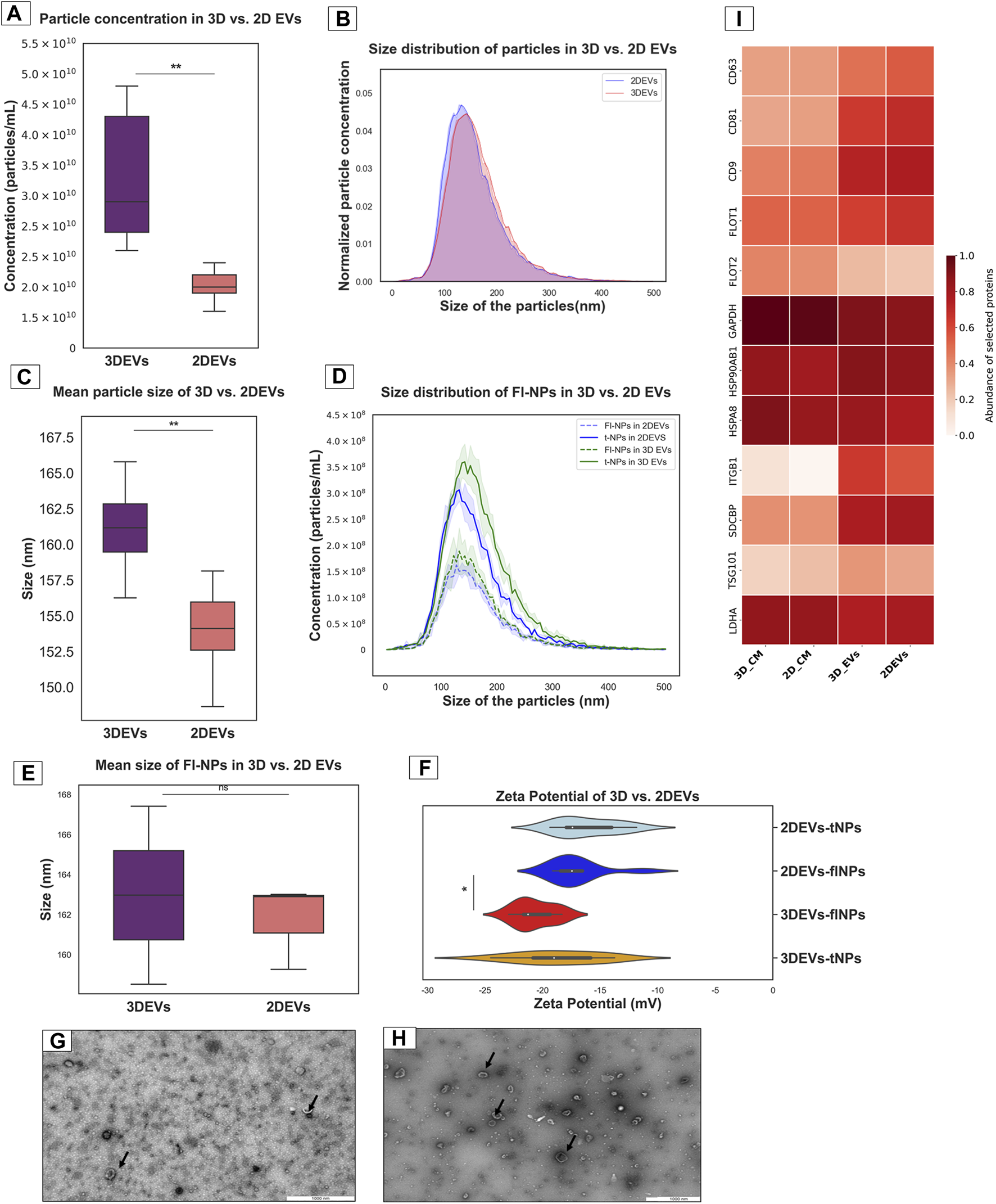 Characterization of nanoparticles derived from trophoblast cells grown in 3D and 2D cell culture systems as EVs (A). Total particle count of nanoparticles released by 3D vs. 2D EVs (B). The number and size profile of both 3D vs. 2D EVs exhibited a typical distribution of particles mainly less than 200 nm in size (C). Mean size of nanoparticles released by 3D vs. 2D EVs (D). Distribution of size and concentration of fluorescent nanoparticles released by 3D vs. 2D EVs (E). Mean size of fluorescent nanoparticles released by 3D vs. 2D EVs. t-NPs: total nanoparticles, fl-NPs: florescent nanoparticles. (F). Zeta potential of nanoparticles and fluorescently labelled nanoparticles in 3D vs. 2D EVs. tNPs: total nanoparticles, flNPs: florescent nanoparticles. EV morphology was assessed using TEM images of isolated EVs secreted from (G). 2D and (H). 3D cell culture systems. Scale bar: 1,000 nm. Black arrow shows EVs with typical characteristics (I). The heat map illustrates the presence and enrichment of specific proteins in 2D EVs compared to 2D CM (2D_CM) and 3D EVs compared to 3D CM (3D_CM). The proteins reported in the heat map show enrichment of standard EV markers in 2D and 3D EV preparations. The mean LFQ value for each protein corresponding to each sample type was log transformed and re-scaled before visualization in the heat map. All the experiments were conducted in biological triplicate (n = 3), data were presented as mean ± SD, and p < 0.05 considered statistically significant.