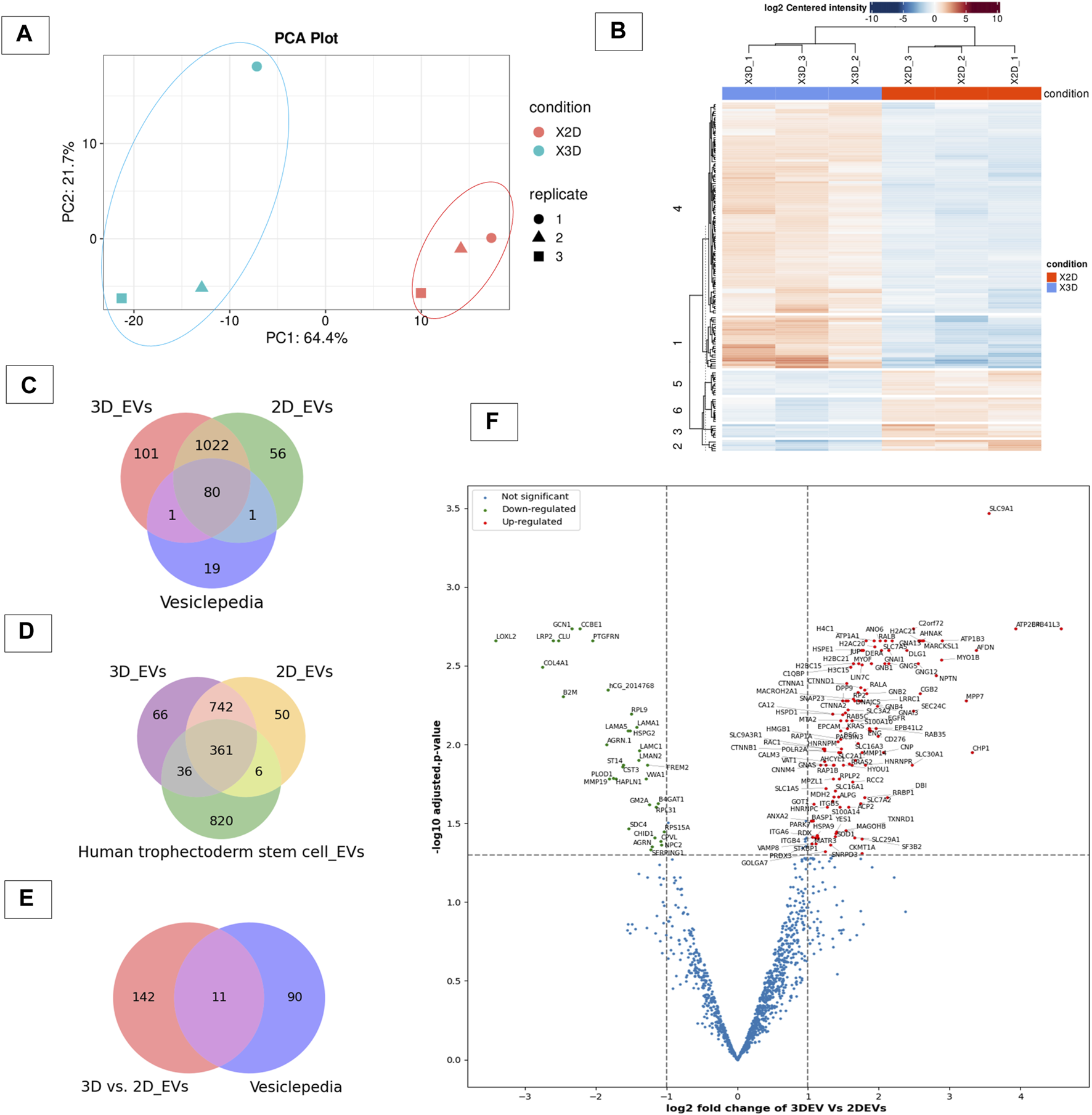 Proteomic profile of 3D vs 2D EVs. (A) Principle component analysis of protein composition of 3D vs. 2D EVs showing distinctive proteomic profiles. (B) Heat map of clustering among samples based on differentially enriched proteins between 3D and 2D EVs. (C) Venn diagram displaying the number of proteins identified in EVs derived from cells grown in 3D and 2D conditions and vesiclepedia most common proteins (top 100 proteins). (D) Venn diagram displaying the number of proteins identified in EVs derived from JAr cells grown in 3D and 2D conditions and proteins enriched in human trophectoderm stem cell derived EVs (Poh et al., 2021). (E) Venn diagram of EV proteins differentially expressed between 3D and 2D culture conditions and vesiclepedia top most common proteins (top 100 proteins). (F) Volcano plot showing differential expressed proteins between 3D and 2D EVs.