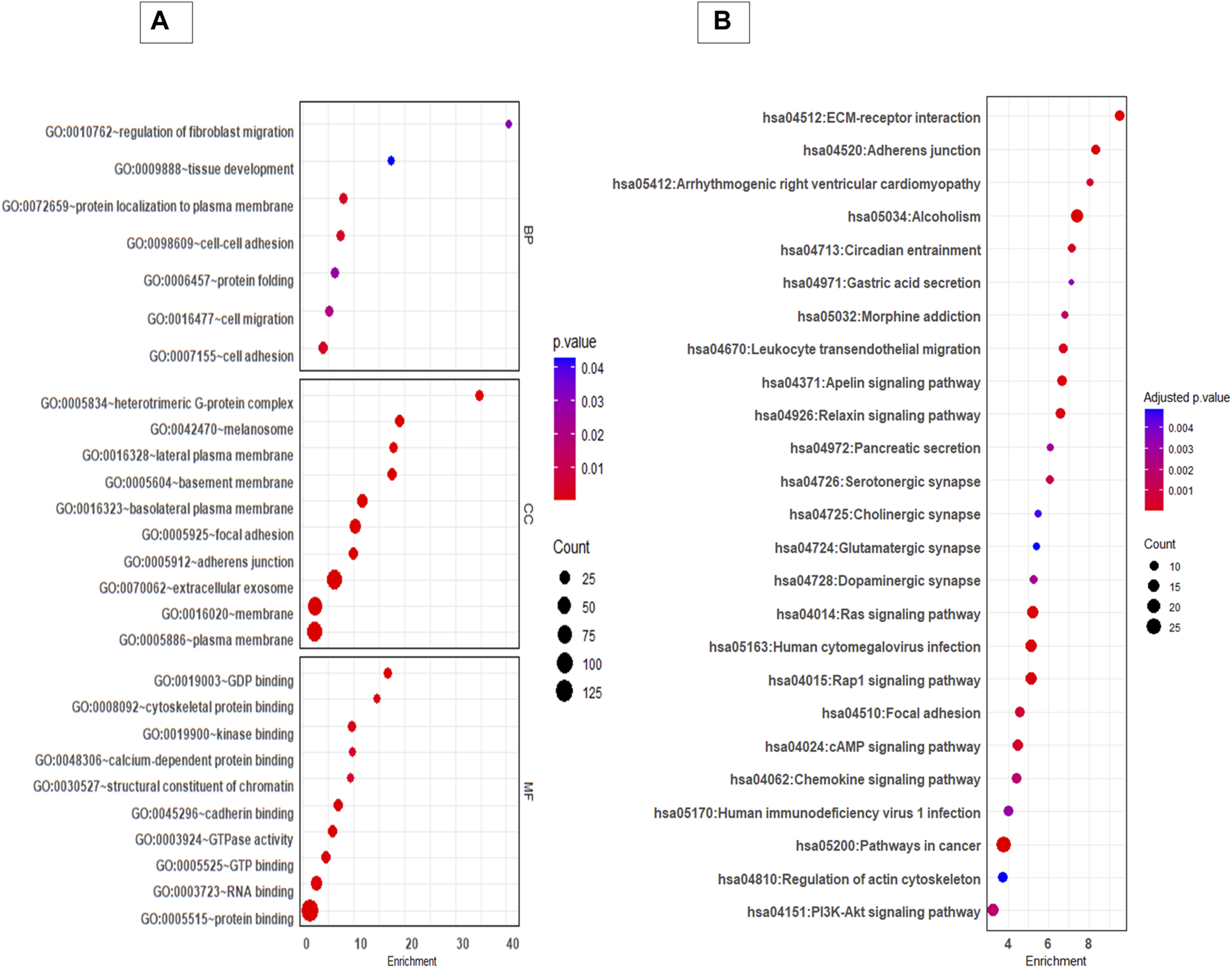 GO and KEGG pathway analysis of differentially expressed proteins between 3D and 2D EVs. (A) GO analysis of biological pathways (BP), cellular components (CC) and molecular function (MF). (B) KEGG enrichment pathways of differentially expressed proteins between 3D and 2D EVs. The colour of the bubble chart show the adjusted p. value and gene count in each term is represented by bubble size.