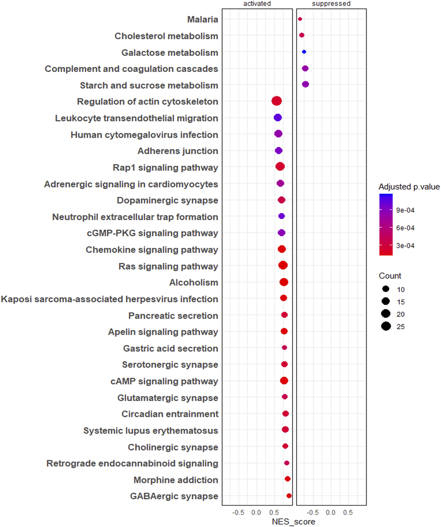 Gene set enrichment analysis (GSEA) of KEGG pathways. The colour of the bubble chart show the adjusted p. value and gene count in each term is represented by bubble size.