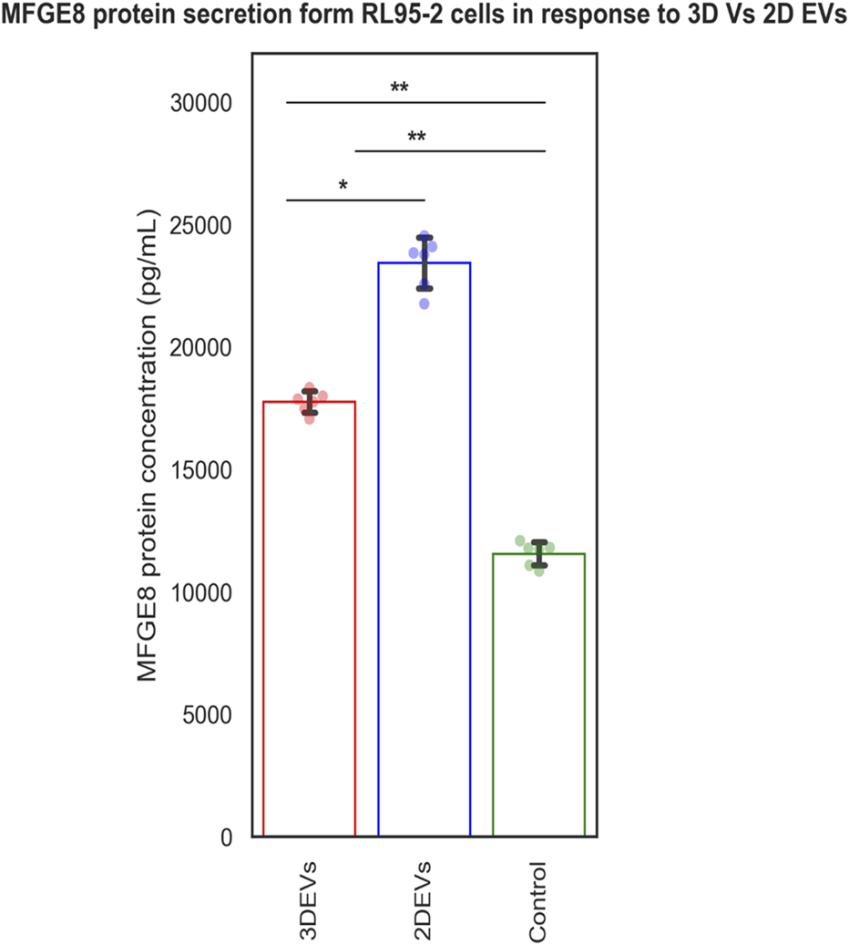 MFGE8 secretion from RL95-2 cells in response to 3D vs 2D EVs.