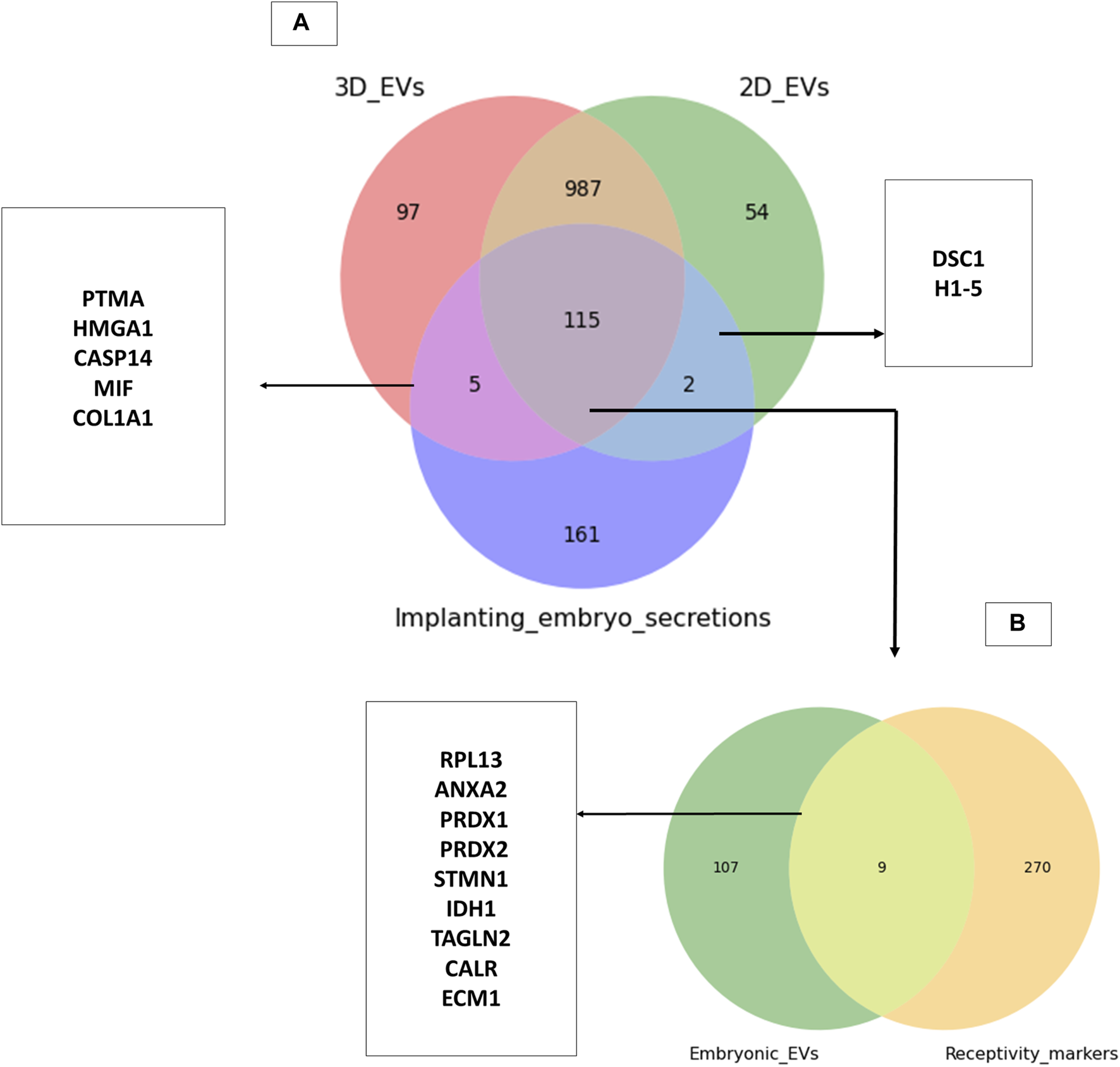 Common proteins between trophoblastic EVs and human embryo secretions. (A) Comparison of 3D and 2D trophoblast cell derived EVs with secretions of human embryos prior to implantation (Poli et al., 2015). (B) Comparison of proteins common to trophoblast EVs and human embryo secretions to known endometrial receptivity markers (Díaz-Gimeno et al., 2011; Enciso et al., 2018).