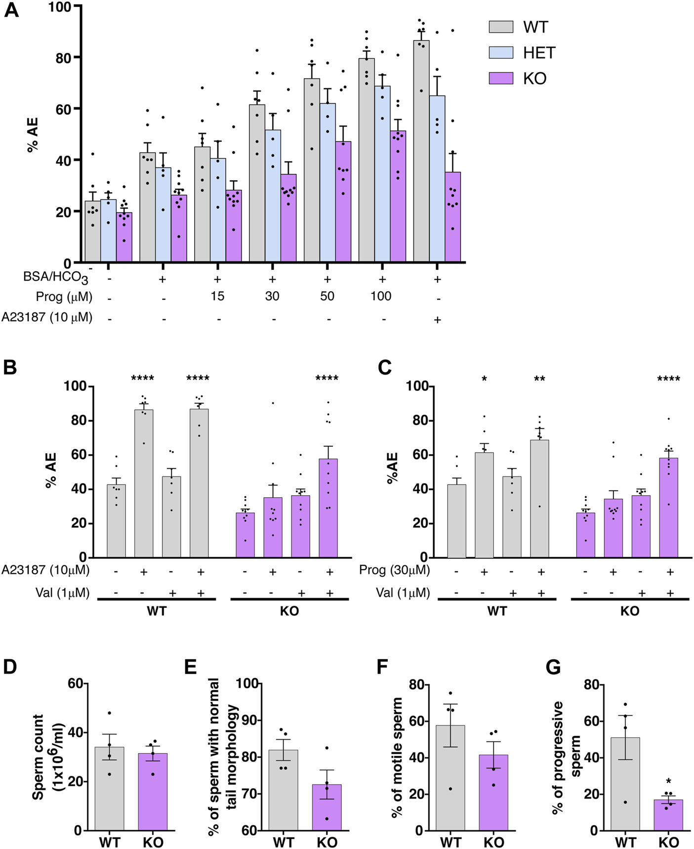 Validation of the EGFP-SLO3 mouse model. (A) Live sperm from wild-type (WT), heterozygote (HET) or knock-out (KO) mice were incubated for 60 min in the presence or absence of BSA/HCO3− medium and challenged with increasing concentrations of progesterone (Prog) to induce AE for 30 min. As a control, 10 μM of A23187 was used. The percentage of live AE sperm was analyzed by flow cytometry. Values represent the mean ± SEM of at least four different experiments (N 4; 7 WT, 4 HET and 9 KO males). (B,C) Sperm from WT or KO mice were incubated for 60 min in capacitating (CAP: BSA/HCO3−) medium in the presence or absence of 1 μM valinomycin (Val) and AE was induced using 10 μM A23187 (B) or 30 μM Prog (C). Values represent the mean ± SEM of at least seven different experiments (N 7, 7 WT and 10 KO males). ****p < 0.0001, **p < 0.01, *p < 0.05 represent statistical difference. Two-way ANOVA in combination with Dunnet’s multiple comparisons test was performed against the control condition (CAP). (D–G) Sperm from WT or KO mice were allowed to swim-Out and the percentage of normal sperm tail morphology was observed in live sperm (E). Values represent the mean ± SEM of four different experiments (N = 4; 4 WT and 4 KO males). Paired t-test, and Non-parametric Wilcoxon-Mann-Whitney test were performed for sperm count and morphology respectively. (F,G) The percentage of motile and progressive sperm was analyzed using CASA. Data represents the mean ± SEM of four different experiments (N = 4; 4 WT and 4 KO males). Non-parametric Wilcoxon-Mann-Whitney test was performed.