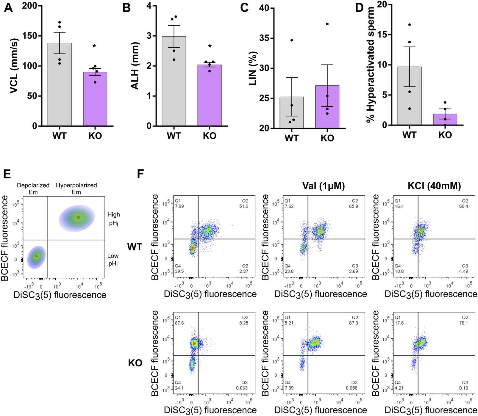 Assessment of HA, pHi, and Em in WT and KO sperm. Live sperm from WT or KO mice where capacitated for 60 min. (A–D) The curvilinear velocity (VCL), amplitude of lateral head displacement (ALH), linearity (LIN) and Hyperactivation (HA) were assessed using CASA. Non-parametric Wilcoxon-Mann-Whitney test was performed to evaluate differences between WT and KO. *p < 0.05 stands for statistical difference between WT and KO. Data represents the mean ± SEM of four different experiments (N = 4; 4 WT and 4 KO males). (E,F) To evaluate pHi, cells were washed and incubated for 20 min with 5 µM BCECF-AM, then washed again and finally incubated with 1 nM DiSC3(5) and 1 µg/mL PI in order to evaluate sperm Em and viability using flow cytometry. (E) A schematic dot-plot of BCECF fluorescence vs. DiSC3(5) fluorescence is shown. (F) Representative dot-plots of BCECF fluorescence vs. DiSC3(5) fluorescence for WT and KO sperm. Capacitated WT and KO sperm were incubated with 1 µM valinomycin for 5 min, data was collected and addition of 40 mM KCl was used. 5 different experiments were performed (N = 5; 5 WT and 5 KO males).