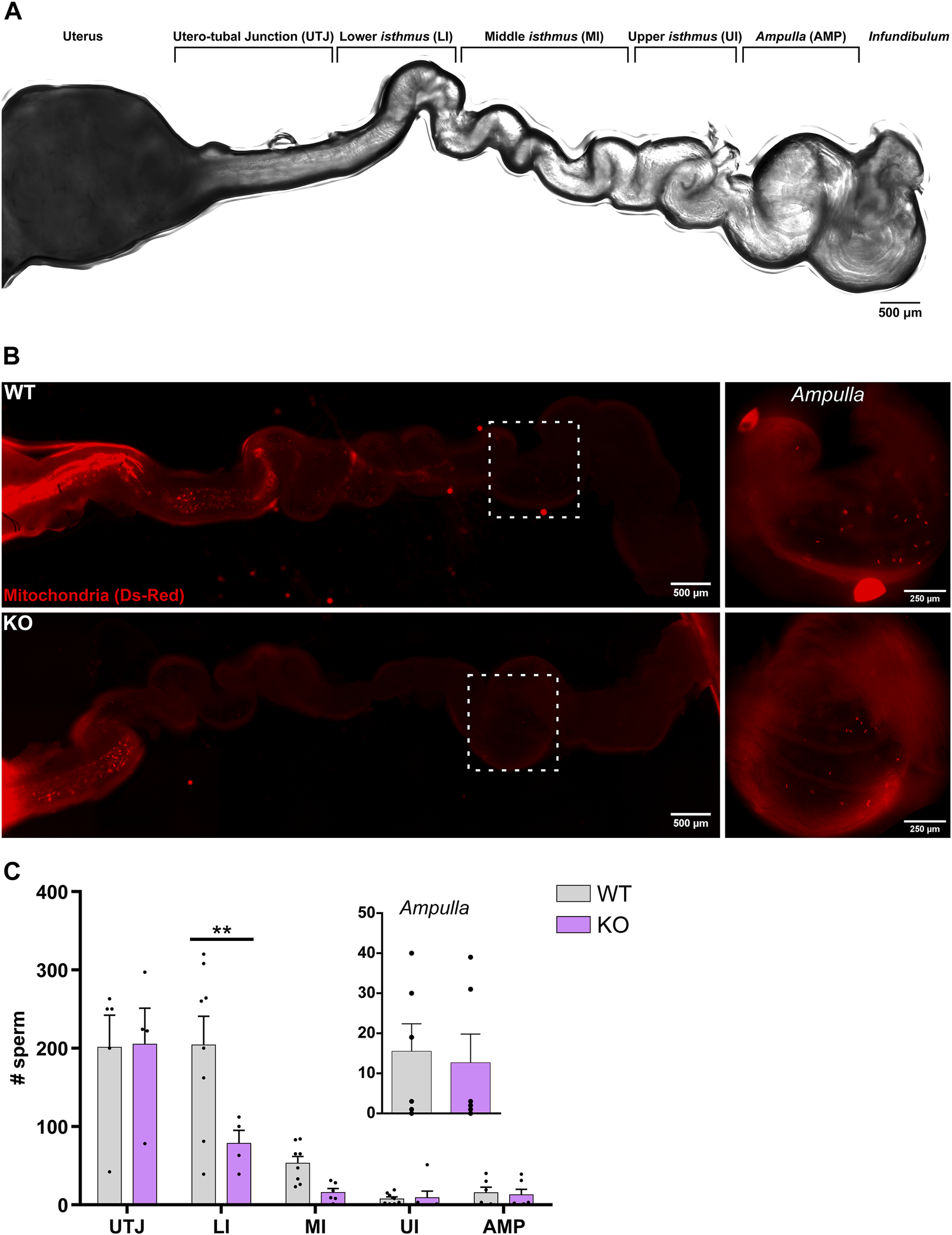 Evaluation of sperm migration in vivo after AM mating. WT or KO male mice and super-ovulated WT females were mated. Successful mating was evidenced by the presence of vaginal plug. Mice were mated at 5AM and plugs were checked 35 min later (AM). (A) Representative bright field image of the female reproductive tract depicting the different regions. (B) Representative epifluorescence images of DsRed2 fluorescence visible through the female tract 4 h post-coitus. Upper-left panel shows sperm from a WT mouse through the entire oviduct and the upper-right panel shows a zoom-in of the ampulla region. Lower-left panel shows sperm from a KO mouse through the entire oviduct and the lower-right panel shows a zoom-in of the ampulla region, showing the presence of sperm from KO mice in the region. (C) Quantification of the number of sperm in WT or KO mice at the different oviduct regions, utero-tubal junction (UTJ), lower isthmus (LI), mid isthmus (MI), upper isthmus (UI) and ampulla (AMP). Each dot represents the count for one oviduct. Values represent the mean ± SEM of at least three different experiments (N 3; 4 WT and 3 KO males, 7 females). **p < 0.01 stands for statistical difference between WT and KO. Multiple t-test corrected for multiple comparisons using the Holm-Sidak's method was performed.