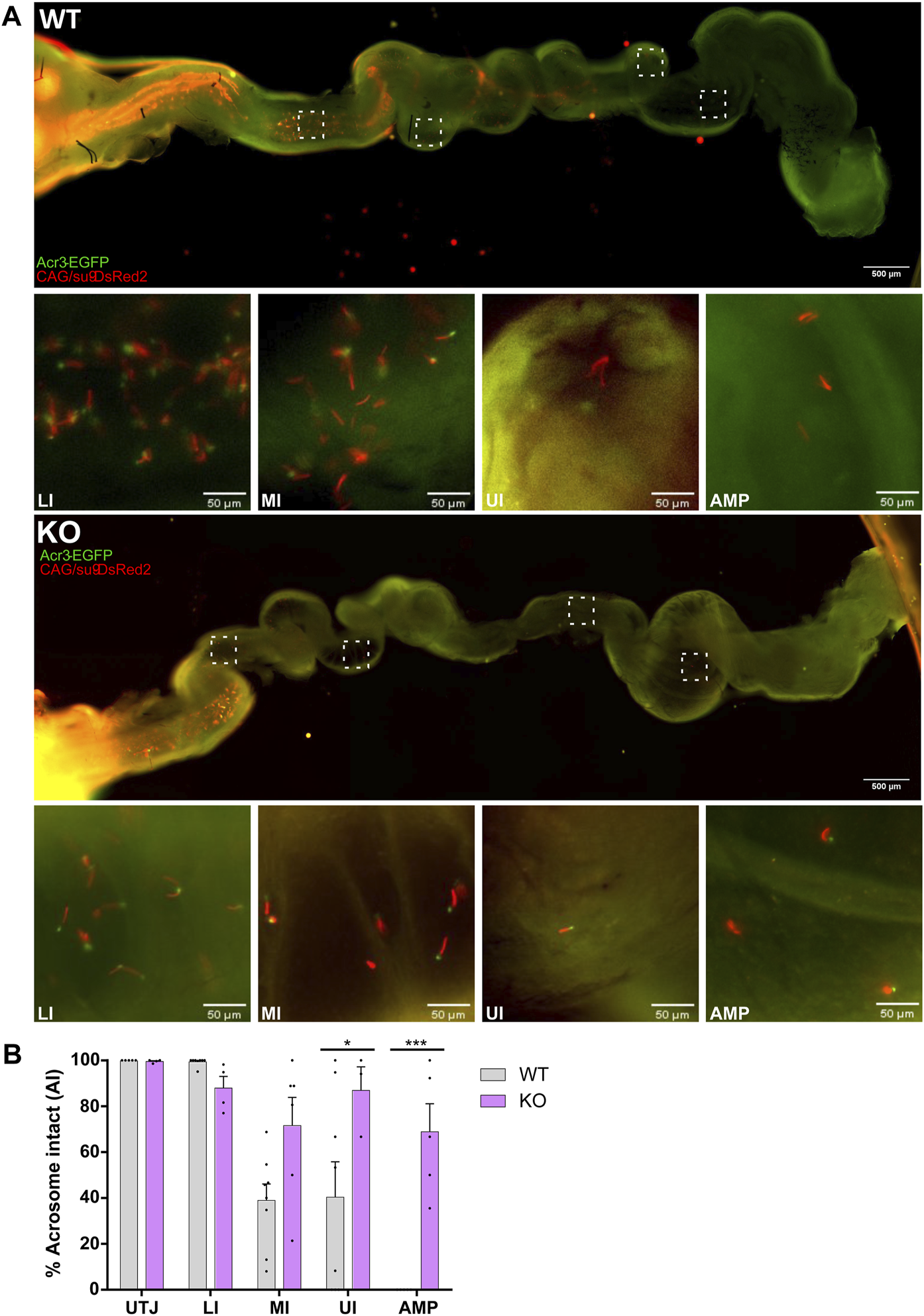 AE in the female oviduct after AM mating. Super-ovulated WT females were mated with EGFP/DsRed2-SLO3 WT or KO male mice. The presence of vaginal plug and sperm in the oviduct was used as an indicator of successful mating. Mice were mated at 5 AM and plugs were checked 40 min later (AM mating). (A) Representative epifluorescence images of DsRed2 and EGFP fluorescence through the female tract 4 h post-coitus. Upper panels show sperm from WT mouse through the entire oviduct, insets of the different segments of the oviduct are displayed as boxes and images acquired with higher magnification of the four different regions, lower isthmus (LI), mid isthmus (MI), upper isthmus (UI) and ampulla (AMP) are shown. Lower panels show the transit of sperm from EGFP/DsRed2-SLO3 KO mice through the oviduct. (B) Quantification of the percentage of acrosome intact (AI) sperm of WT or KO mice for each oviduct in its different regions, utero-tubal junction (UTJ), LI, MI, UI and AMP. Each dot represents the count for one oviduct Values represent the mean ± SEM of at least three different experiments (N 3; 4 WT and 3 KO males, 7 females). ***p < 0.001, *p < 0.05 stands for statistical difference between WT and KO. Multiple t-test corrected for multiple comparisons using the Holm-Sidak’s method was performed.