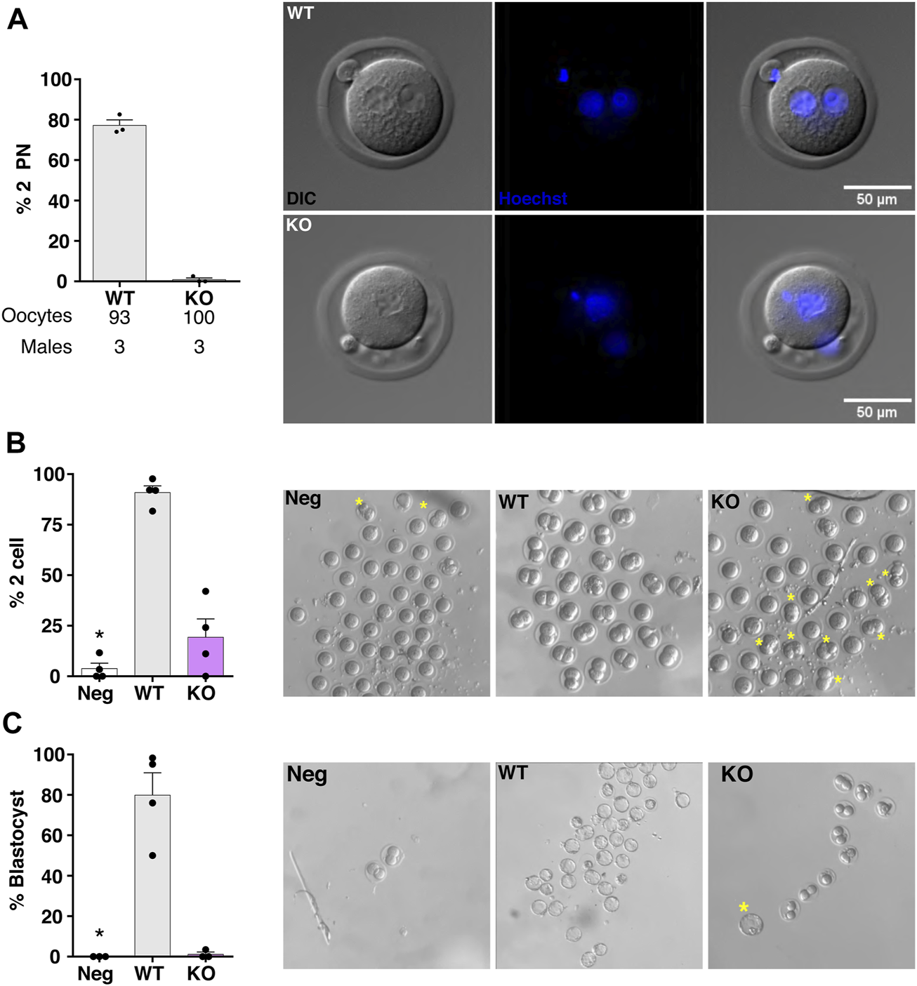 COCs from mated females were placed in drops of TYH IVF medium immersed in mineral oil, 20 h post hCG. Cells were immediately washed 3 times, with TYH IVF medium, to rinse off the cumulus cells and left in an incubator with 5% CO2 and 37°C for 24 h. The next day, progression to the two-cell (2-cell) stage was evaluated. Embryos in the 2-cell stage were washed and incubated in drops of KSOM medium immersed in mineral oil. After 72 h, development to blastocyst was observed. The percentage of blastocyst was obtained. Intermediate blastocyst, fully developed blastocyst and hatched blastocyst were counted as positive blastocysts, over the total of 2-cell embryos that were left to develop. A total 6 males (3 WT and 3 KO) and 12 WT females were used. A total of 220, 203 and 153 oocytes were collected from matings with KO males, WT males or not mated respectively. A total of 52, 183 and 7 two-cell embryos and 1,176 and 0 blastocysts were obtained for matings with KO males, WT males or not mated, respectively.